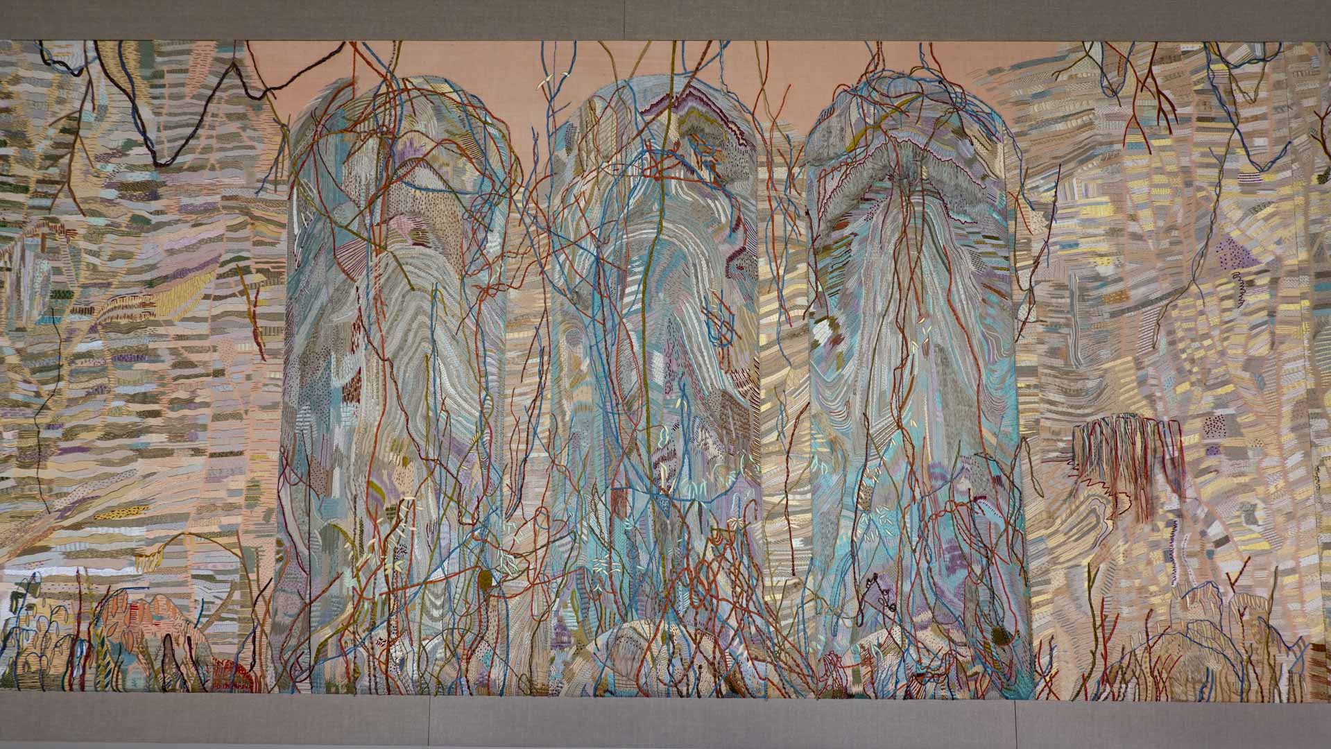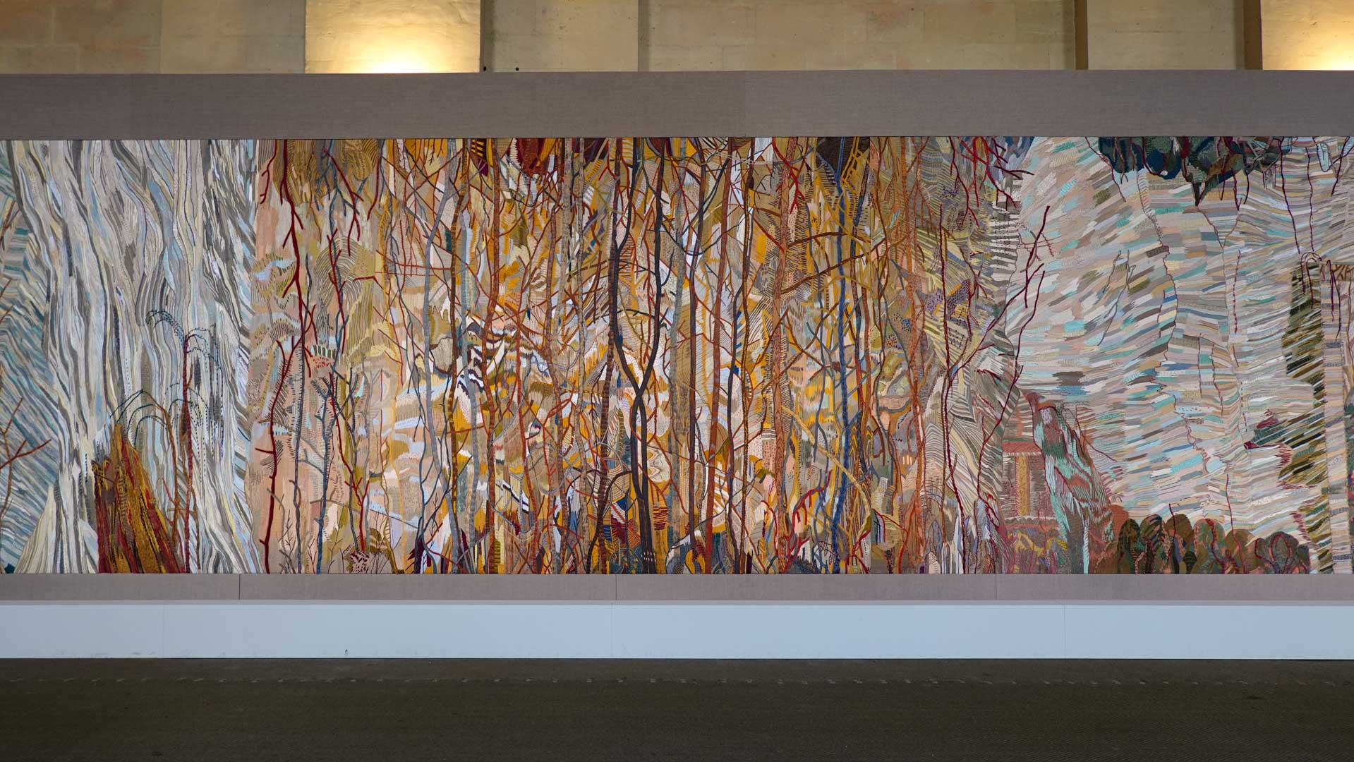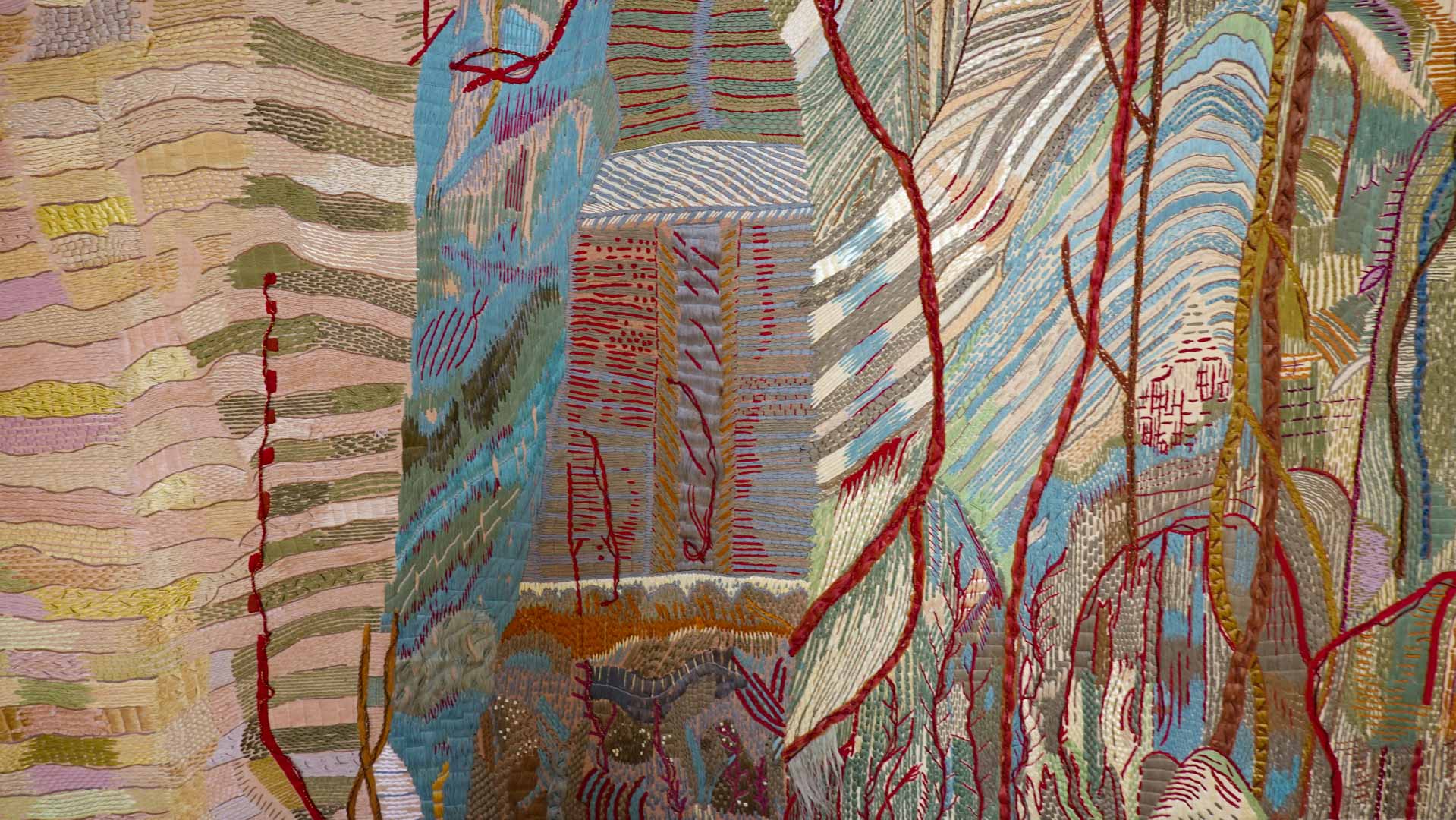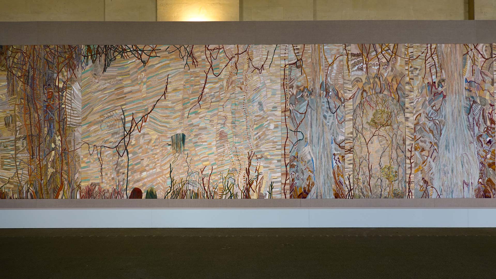 Avec l'ajout d'un panneau brodé inspiré des bosquets versaillais, notamment les Bains d'Apollon, Eva Jospin établit un dialogue entre l'art du jardin et la broderie.