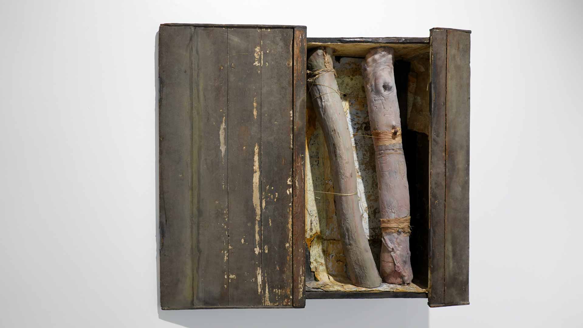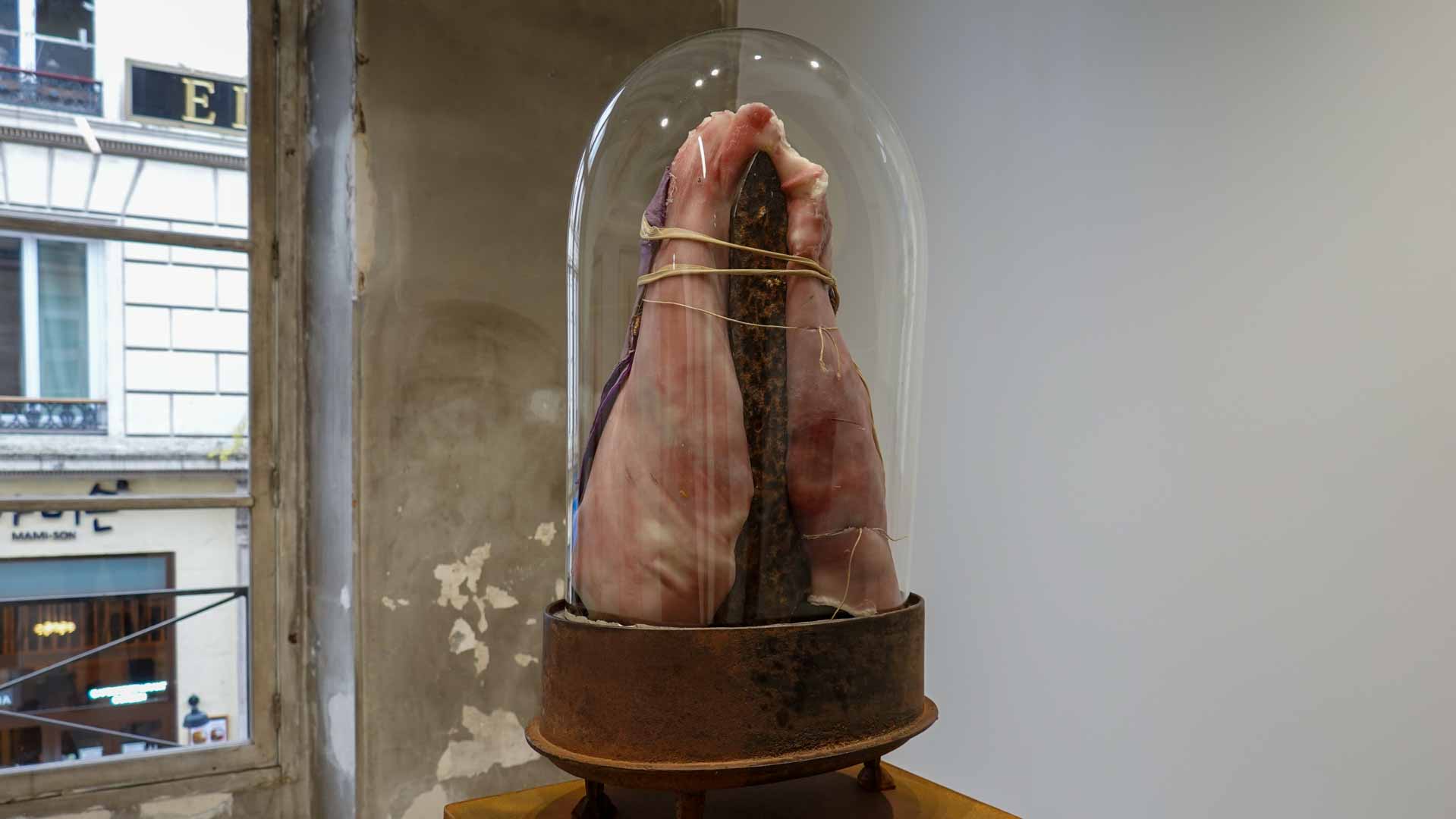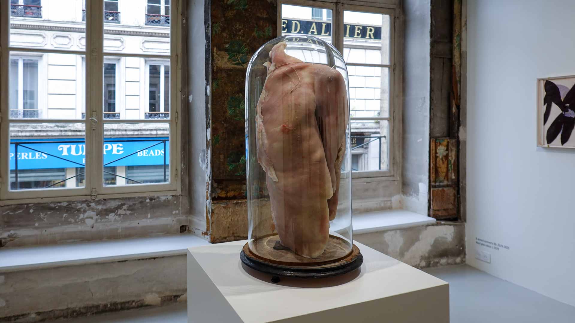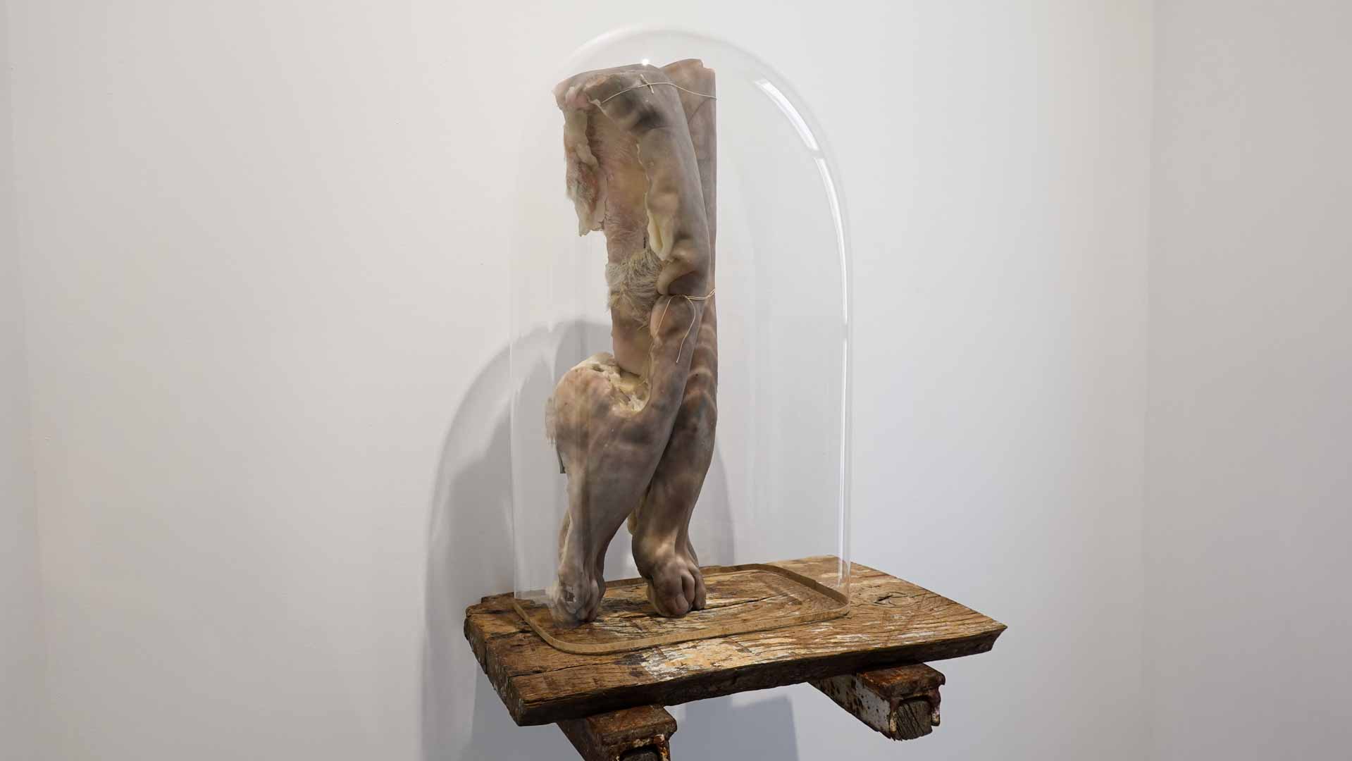 Les œuvres exposées utilisent des matériaux comme la cire, peaux animales, bois, textiles usés, rappelant la chair et l’organique. Parmi les pièces marquantes : les vitrines *Need VI* et *Need VII*, qui associent branches, peaux et corps en cire, ainsi que la sculpture *Madonna del Parto*. Ces œuvres oscillent entre attirance et répulsion, vie et mort, sacré et violence, en s’inspirant de l’iconographie religieuse, mythologique et de la nature.