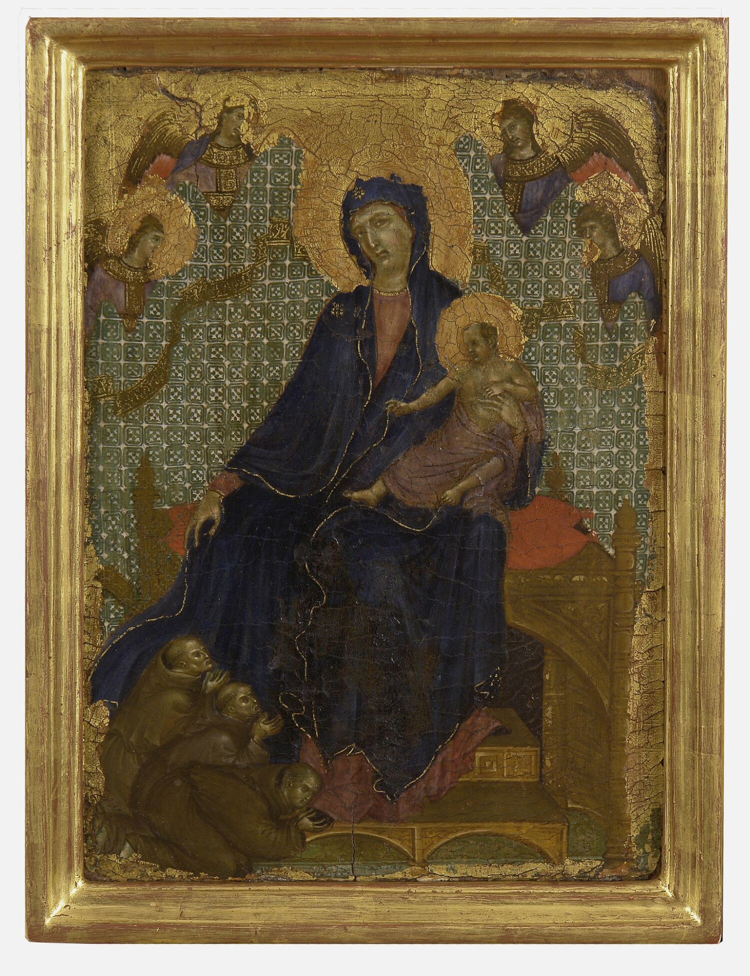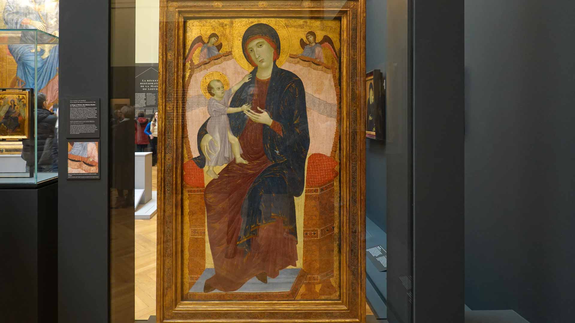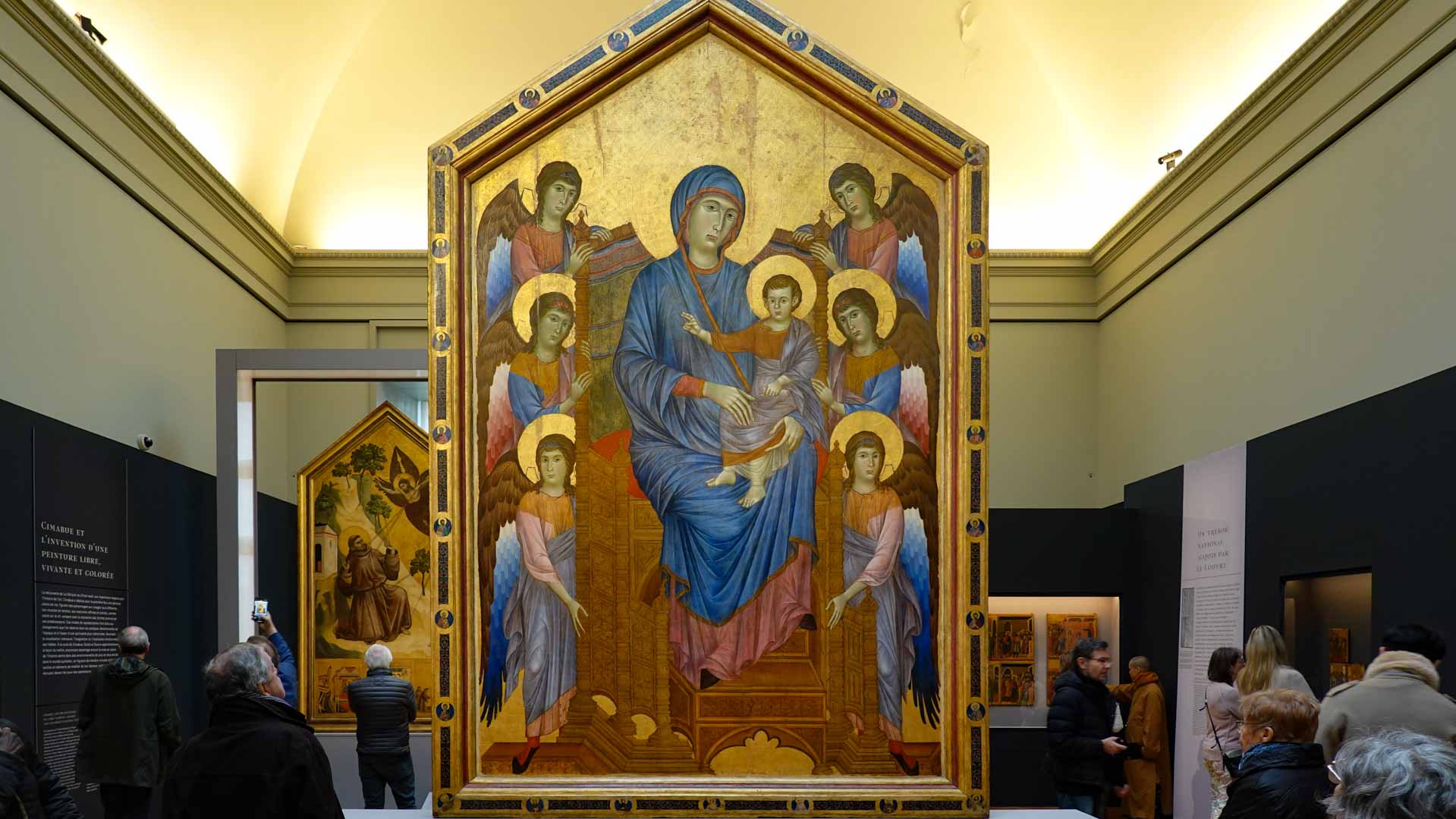 Parmi les œuvres majeures de Cimabue, la "Maestà" (ou "Vierge en majesté") est remarquable. Cette peinture, réalisée vers 1280, représente la Vierge Marie trônant avec l'Enfant Jésus, entourée d'anges et de saints. Elle illustre la transition vers un style plus humaniste, avec des figures plus expressives et une composition plus dynamique.