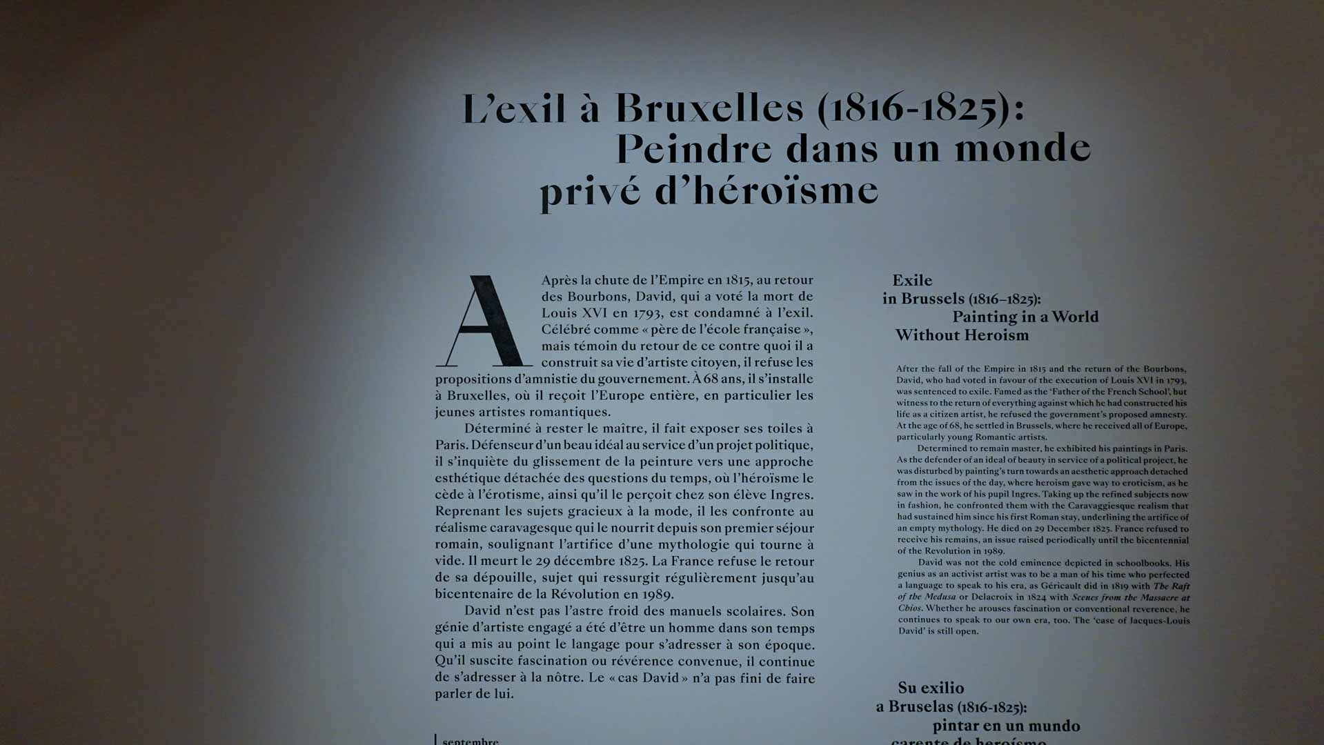 L’exposition « Jacques-Louis David » au Musée du Louvre marque le bicentenaire de la mort du peintre. Réunissant près d’une centaine d’œuvres majeures, elle retrace toute la carrière de ce maître du néoclassicisme, depuis ses débuts à Rome jusqu’à son exil à Bruxelles. Le parcours met en lumière non seulement la virtuosité technique de David mais aussi la portée politique et morale de sa peinture. On y découvre un artiste engagé, traversant la Révolution, l’Empire et la Restauration, oscillant entre idéalisme antique et réalisme dramatique.