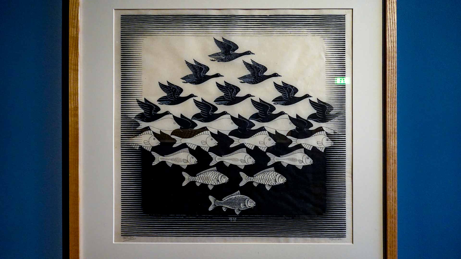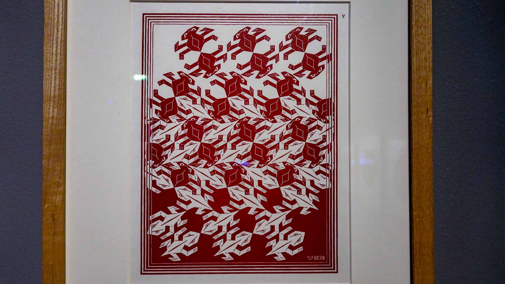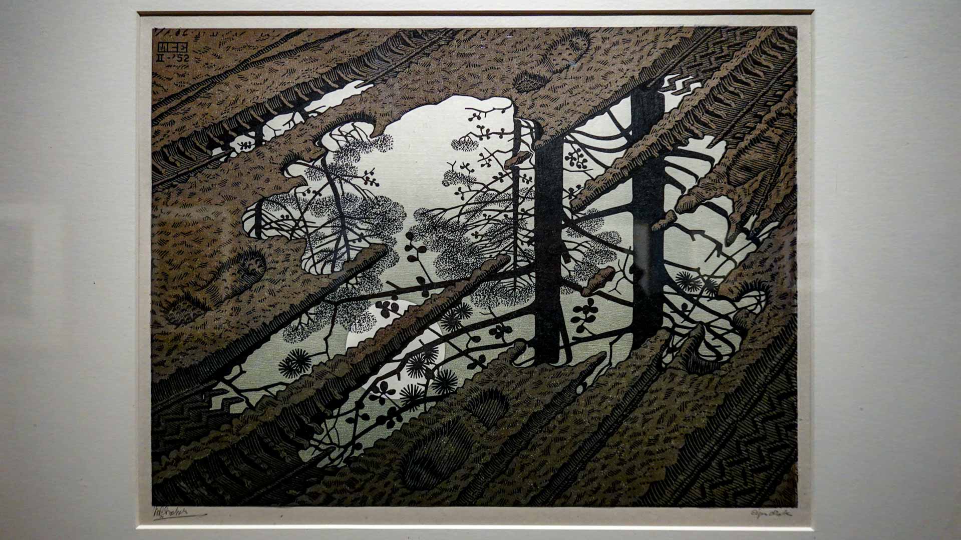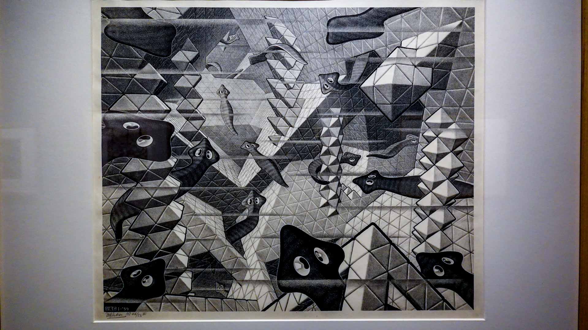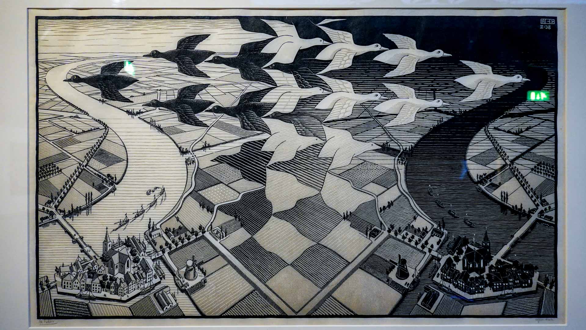 Son œuvre explore des mécanismes spatiaux et mathématiques complexes : perspective classique mais aussi perspective inversée, multiples points de fuite et perspectives impossibles comme dans Relativity, où les repères de gravité se contredisent. Il utilise les tessellations avec une rigueur quasi scientifique, transformant des motifs décoratifs hérités de l’art islamique en créatures qui se métamorphosent et s’emboîtent sans lacune, comme dans Ciel et Eau ou Reptiles. Les séries Circle Limit témoignent de son intérêt pour la géométrie hyperbolique, qu’il rend visible grâce à des transformations continues qui évoquent l’infini.