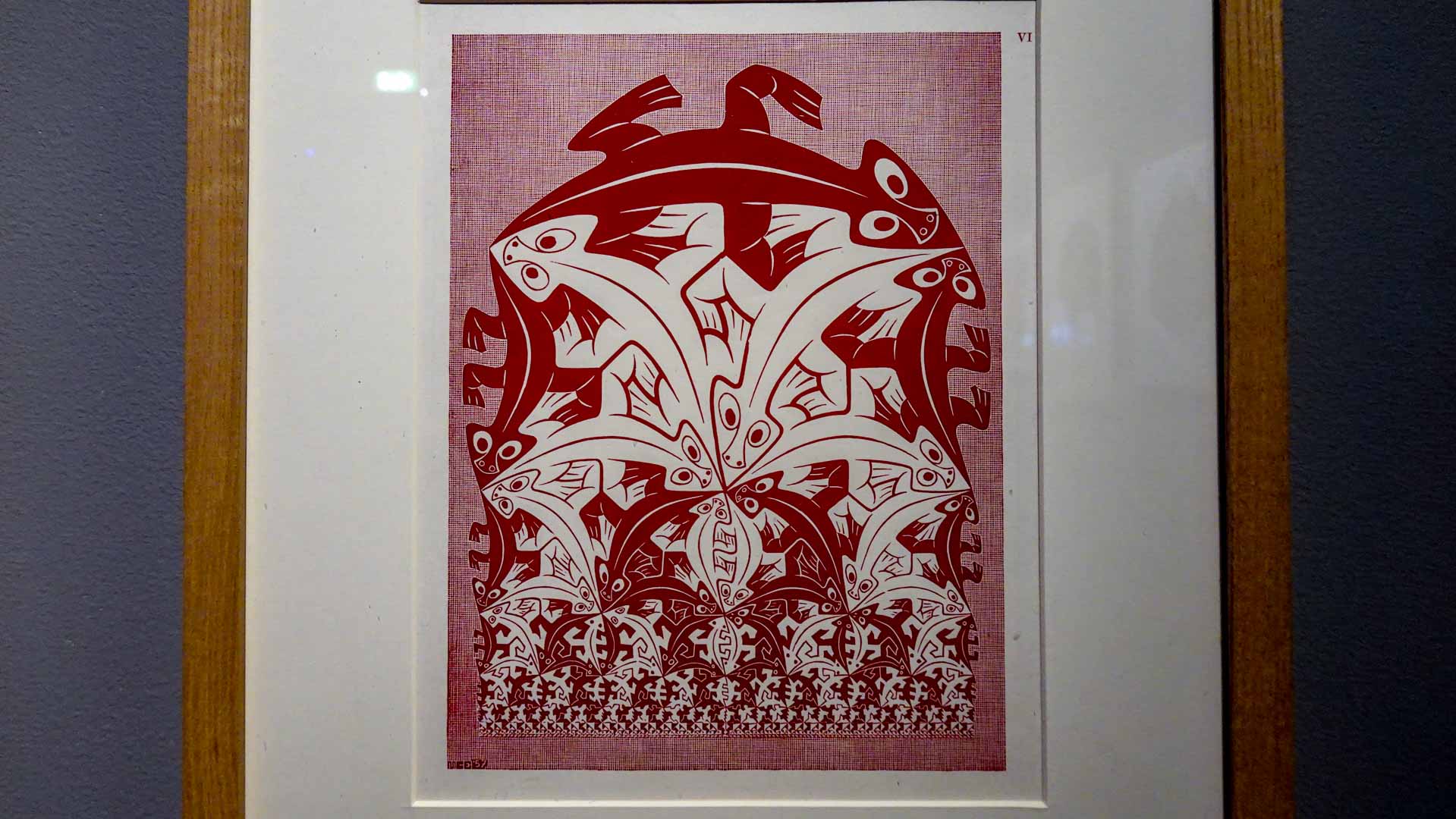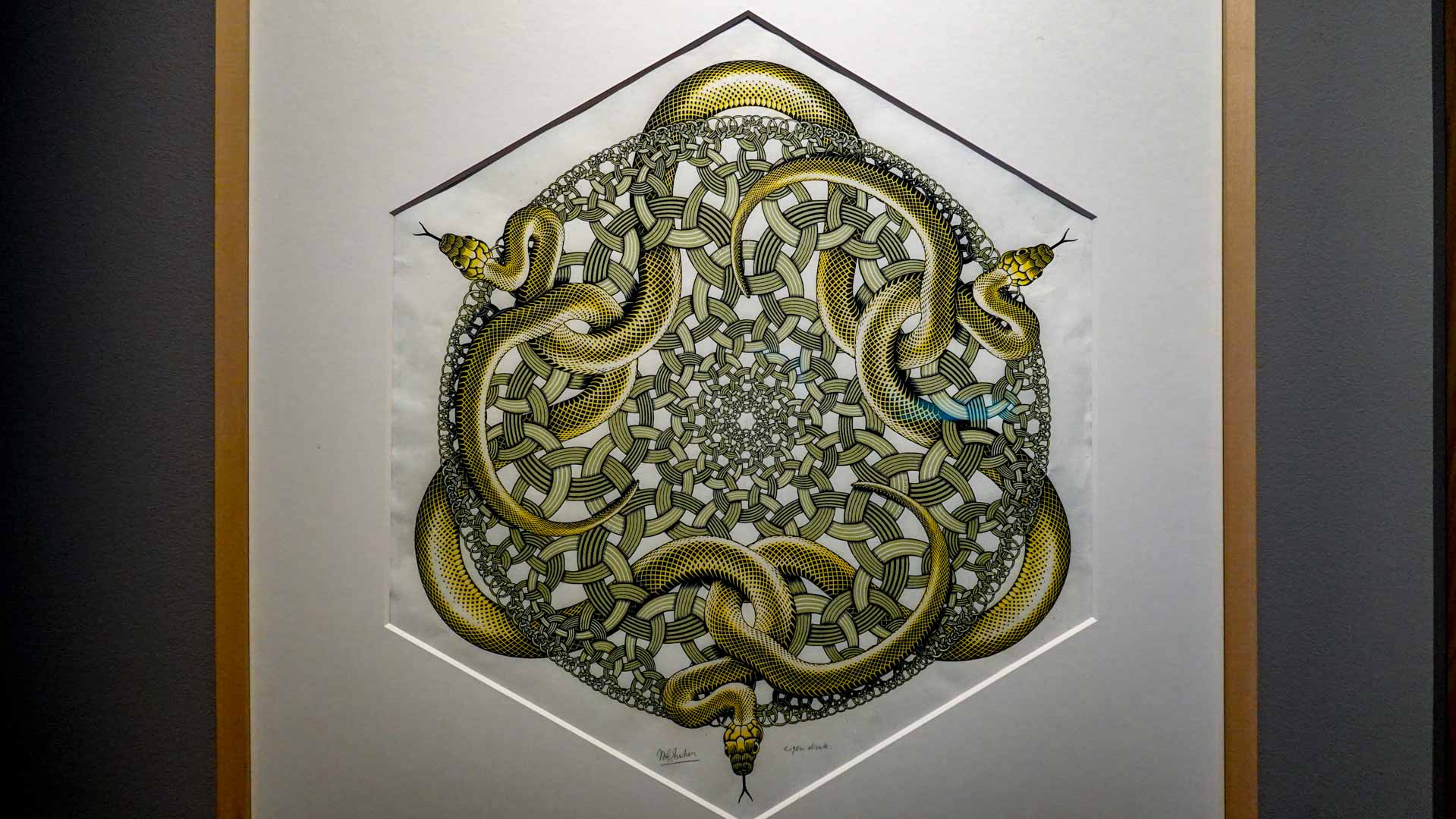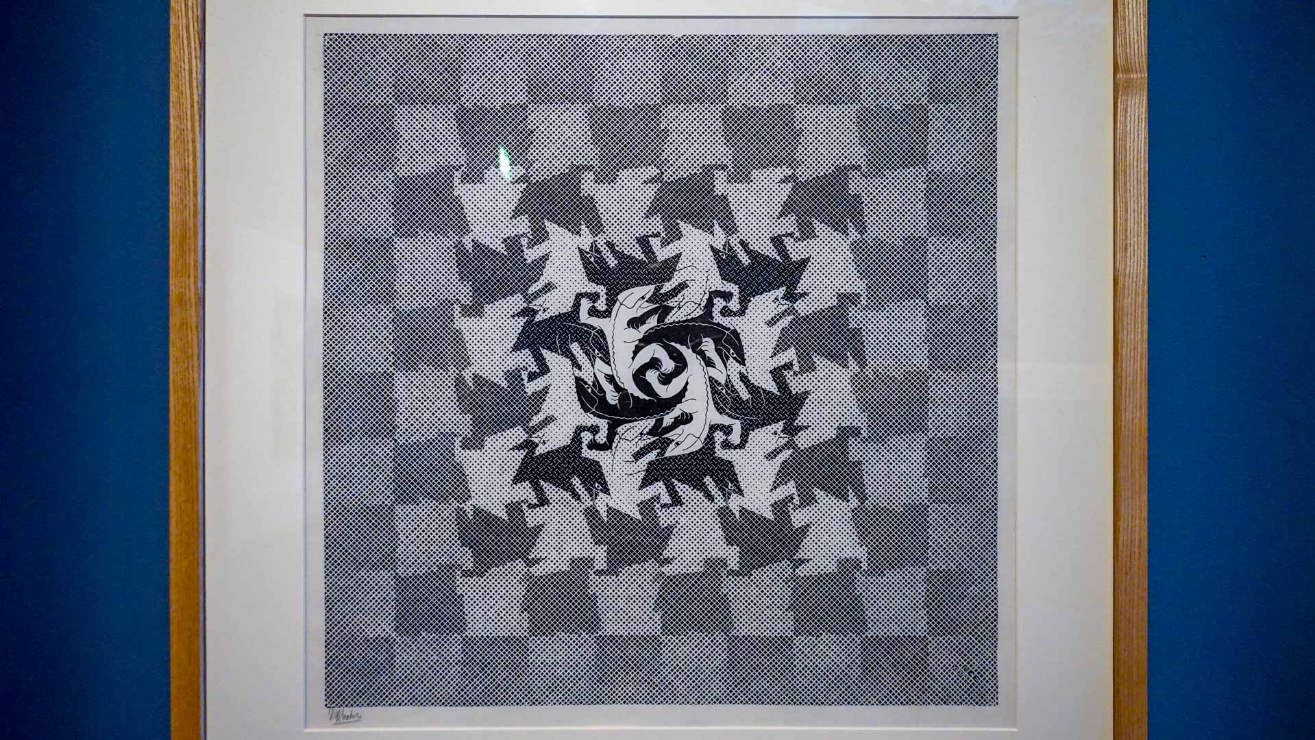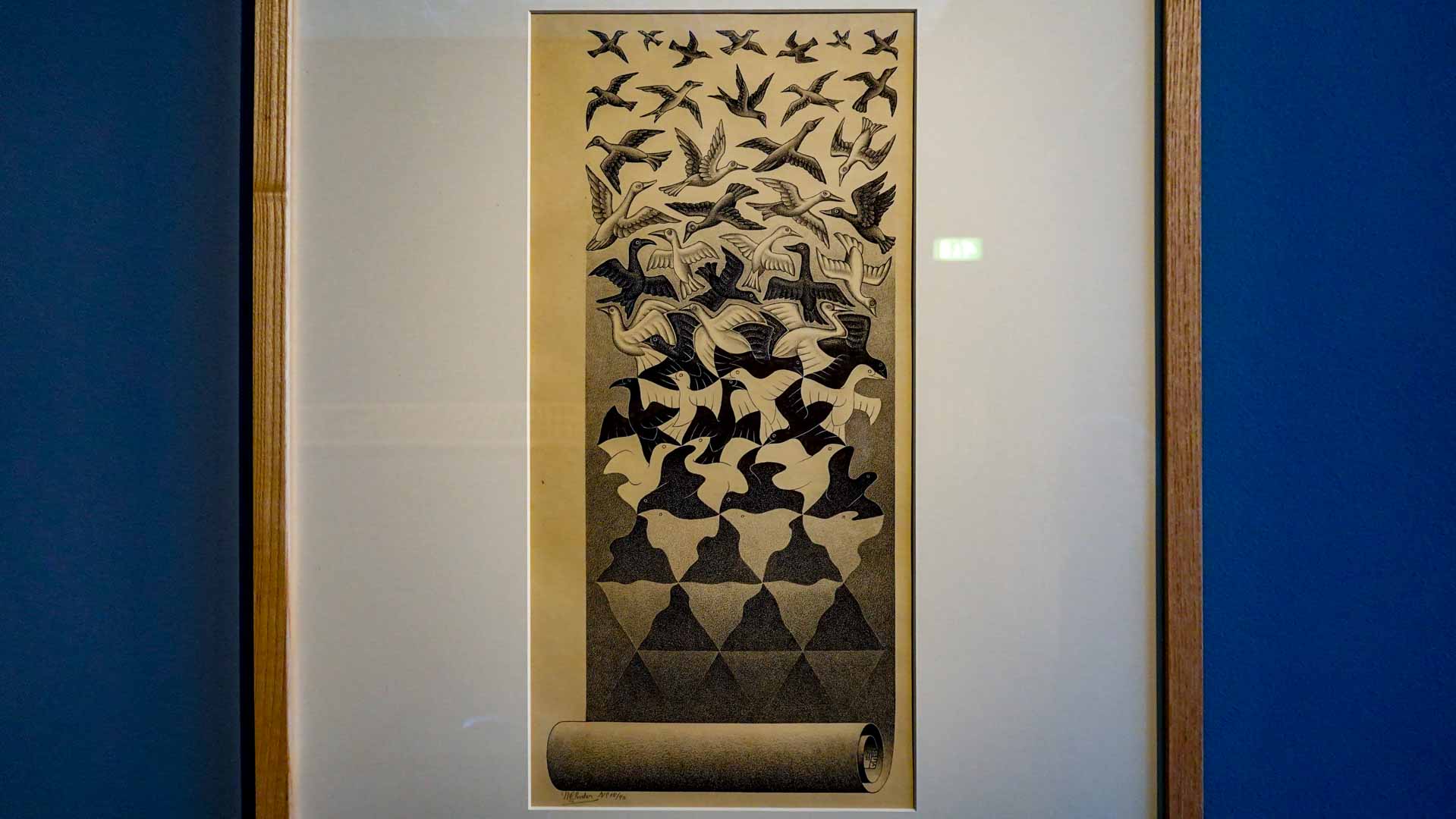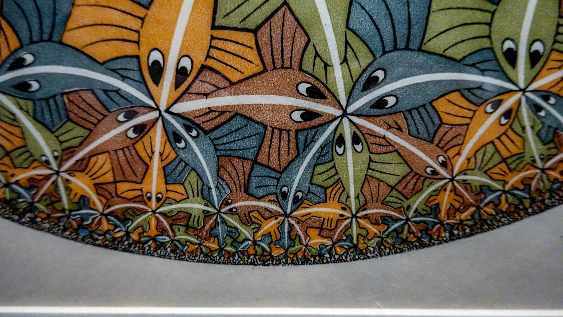 Son œuvre explore des mécanismes spatiaux et mathématiques complexes : perspective classique mais aussi perspective inversée, multiples points de fuite et perspectives impossibles comme dans Relativity, où les repères de gravité se contredisent. Il utilise les tessellations avec une rigueur quasi scientifique, transformant des motifs décoratifs hérités de l’art islamique en créatures qui se métamorphosent et s’emboîtent sans lacune, comme dans Ciel et Eau ou Reptiles. Les séries Circle Limit témoignent de son intérêt pour la géométrie hyperbolique, qu’il rend visible grâce à des transformations continues qui évoquent l’infini.