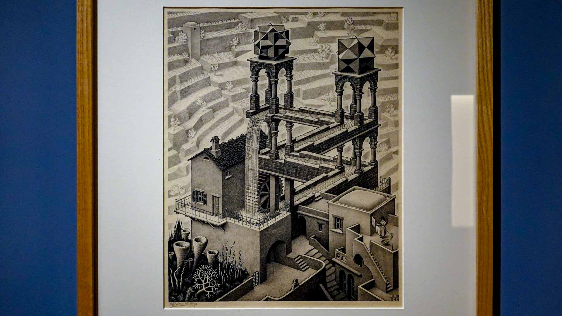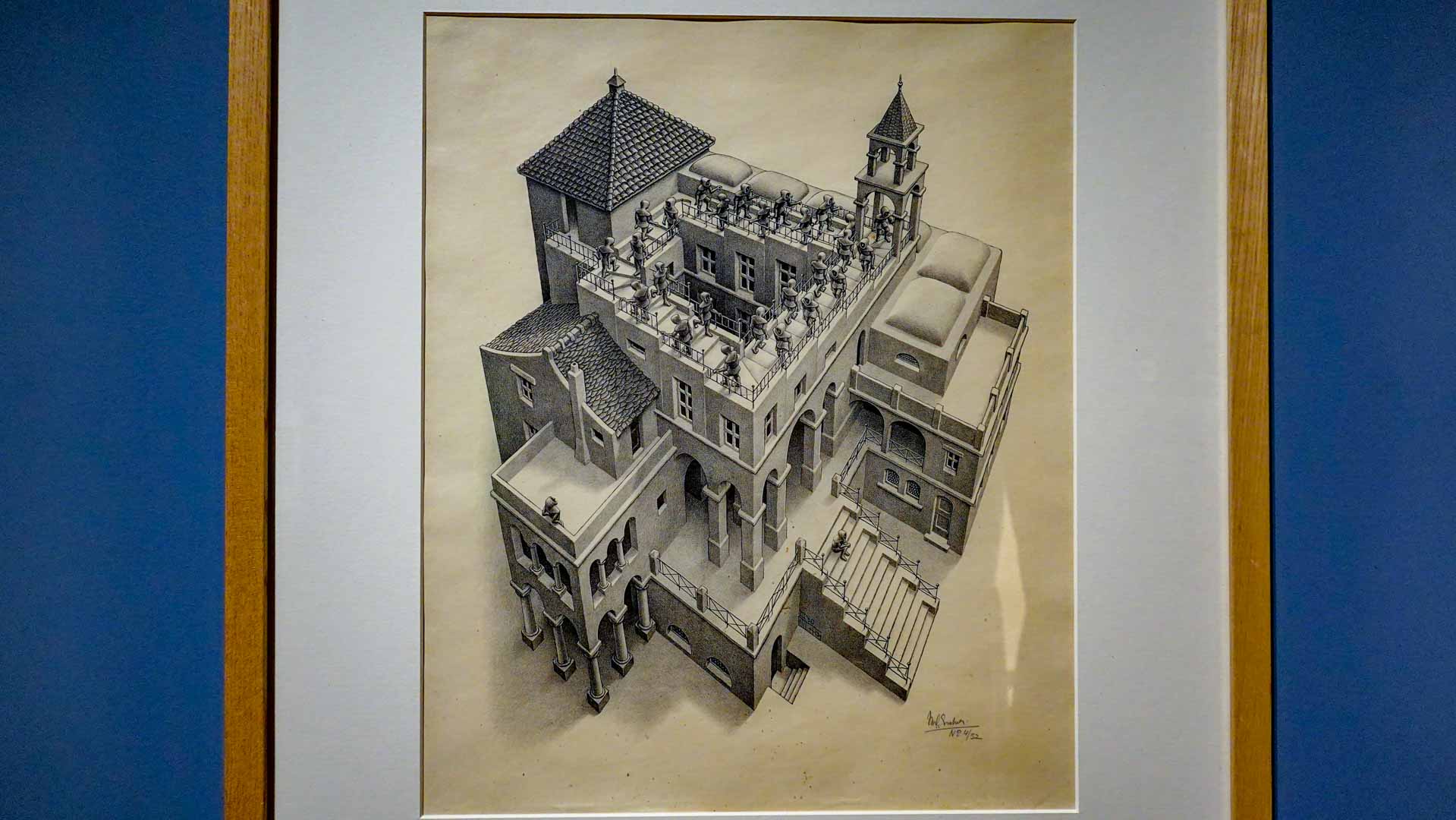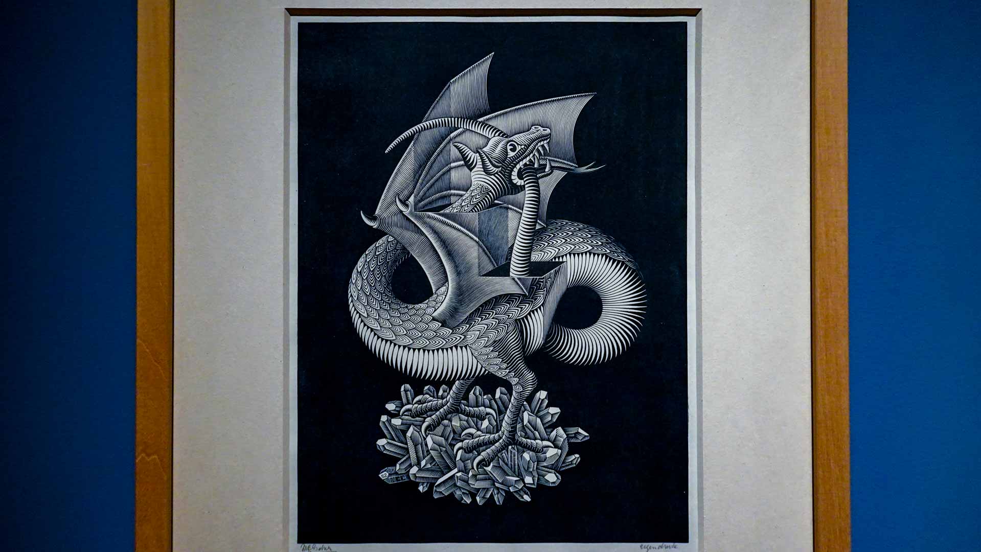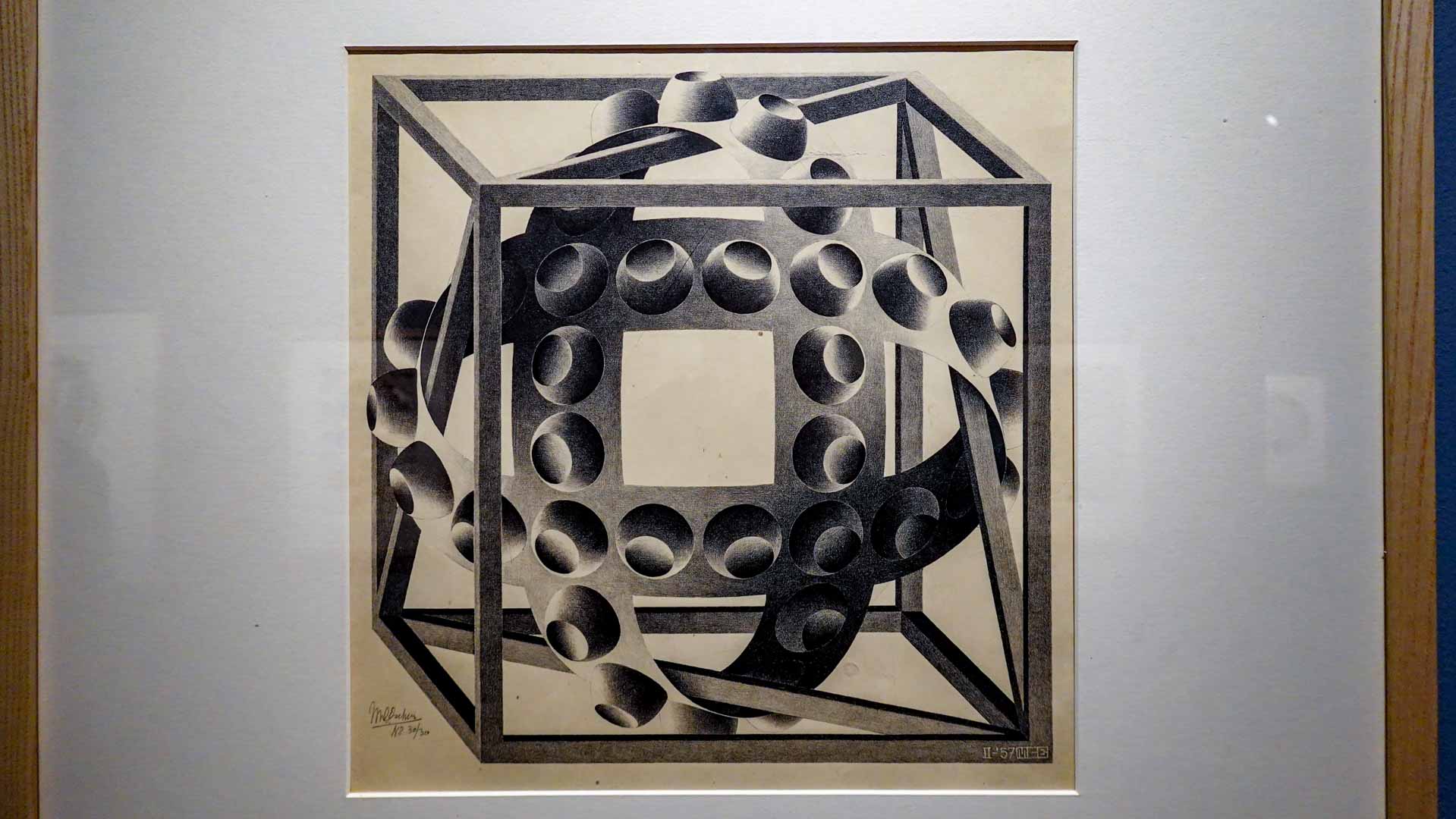 Son œuvre explore des mécanismes spatiaux et mathématiques complexes : perspective classique mais aussi perspective inversée, multiples points de fuite et perspectives impossibles comme dans Relativity, où les repères de gravité se contredisent. Il utilise les tessellations avec une rigueur quasi scientifique, transformant des motifs décoratifs hérités de l’art islamique en créatures qui se métamorphosent et s’emboîtent sans lacune, comme dans Ciel et Eau ou Reptiles. Les séries Circle Limit témoignent de son intérêt pour la géométrie hyperbolique, qu’il rend visible grâce à des transformations continues qui évoquent l’infini.