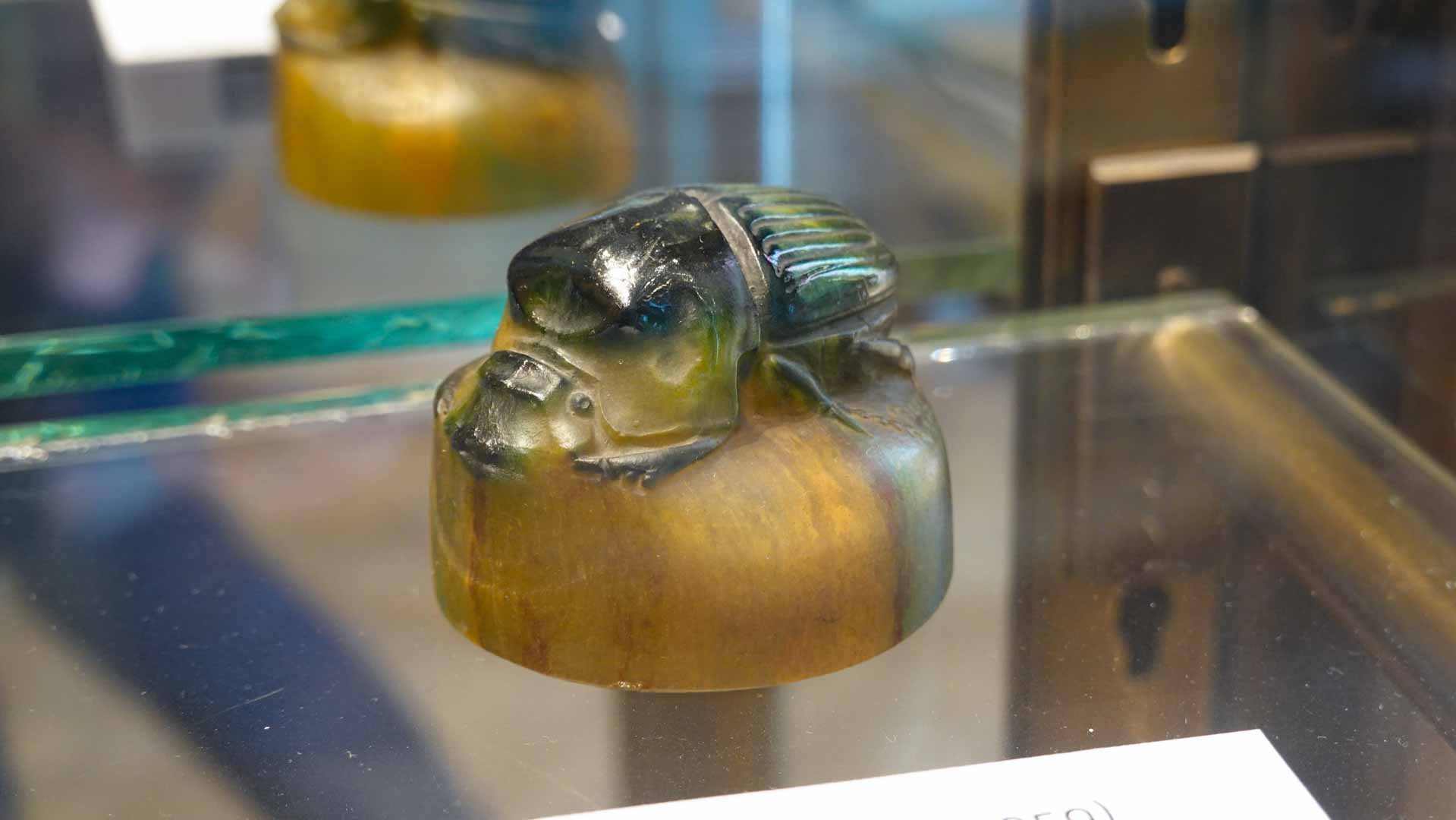 La marqueterie de verre, brevetée en 1898, est l’un des apports majeurs de Gallé. Elle consiste à insérer, dans la masse encore chaude, des fragments de verre de teinte ou de texture différente. Fusionnés par recuisson, ces fragments composent des motifs décoratifs intégrés à la structure même de l’objet, et non simplement appliqués.