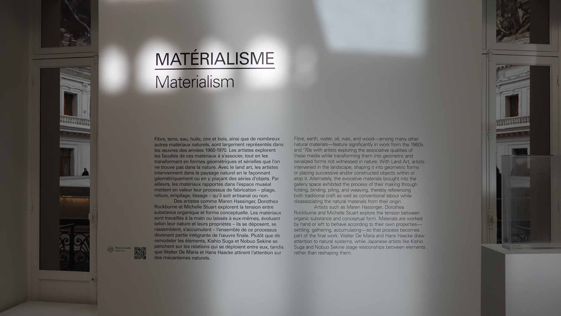 D’autres artistes sont présentés dans des espaces dédiés, comme Agnès Martin, ou investissent l’architecture du bâtiment, à l’image de Meg Webster ou Charlotte Posenenske, soulignant la dimension spatiale et perceptive qui traverse l’ensemble du parcours.