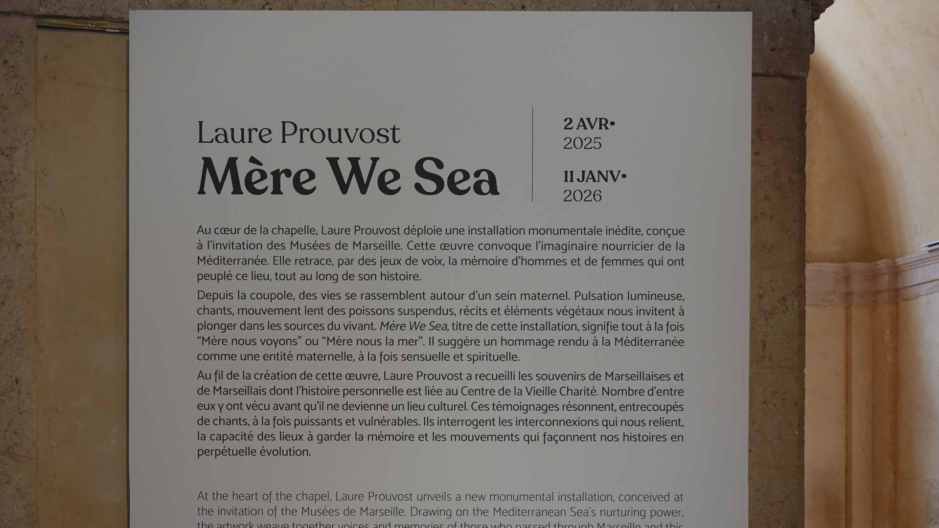 "Les chants entrecoupés de voix qui habitent l’espace, racontent une histoire subjective et intime du lieu composée de souvenirs qui surgissent de la mémoire des anciens et anciennes habitants et habitantes de la Charité. Ces paroles, collectées avec la complicité de chercheuses en sciences sociales de l’EHESS de Marseille, ont été ensuite montées, coupées, assemblées par Laure Prouvost. Le script ainsi composé est, à l’instar des titres des expositions de l’artiste ou des voix-off de ses films, révélateur de son goût pour les jeux de langues et de langage."