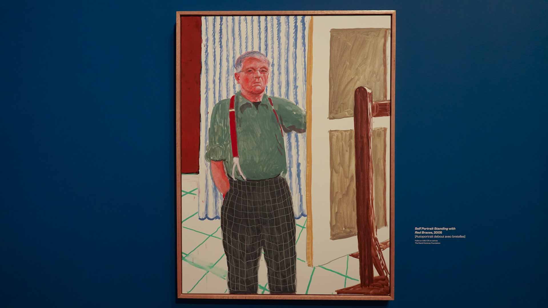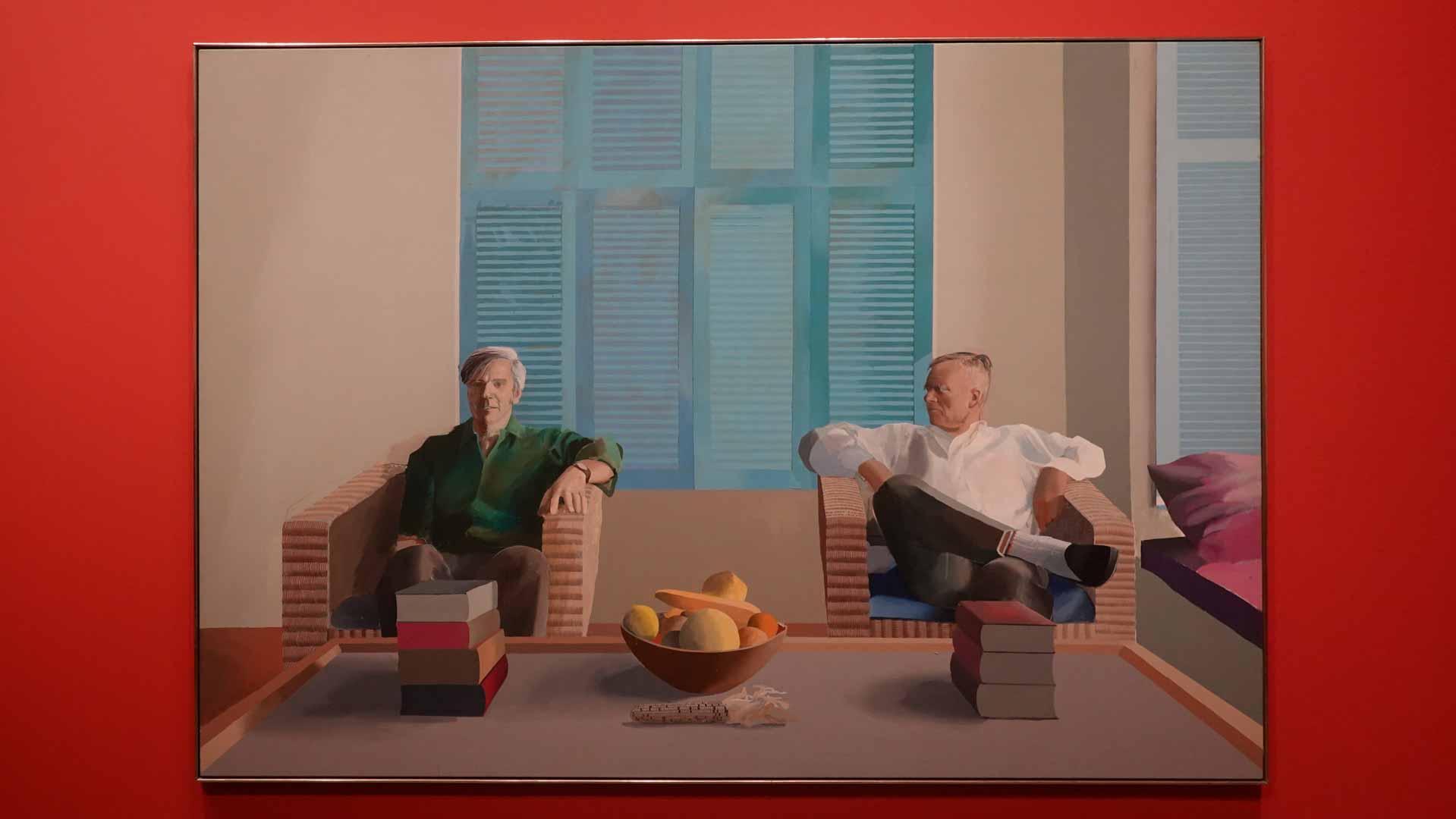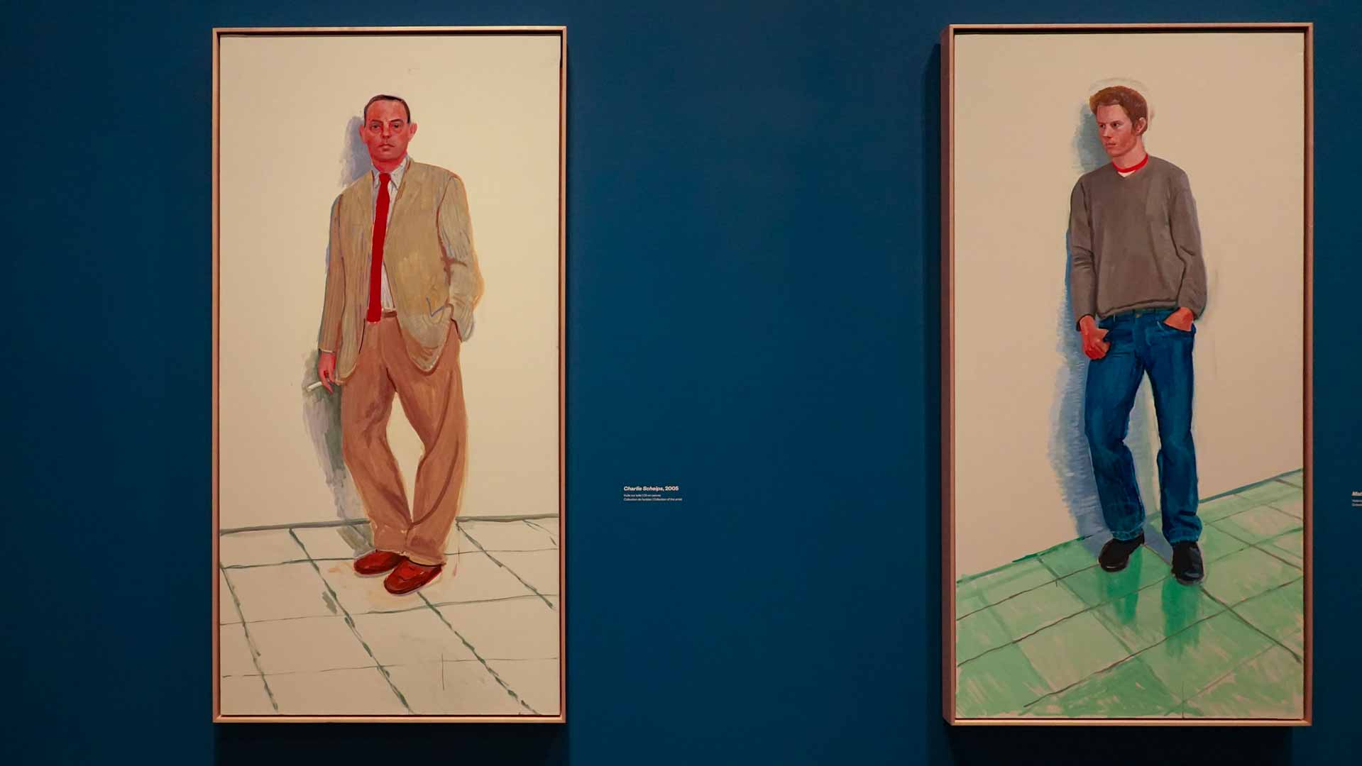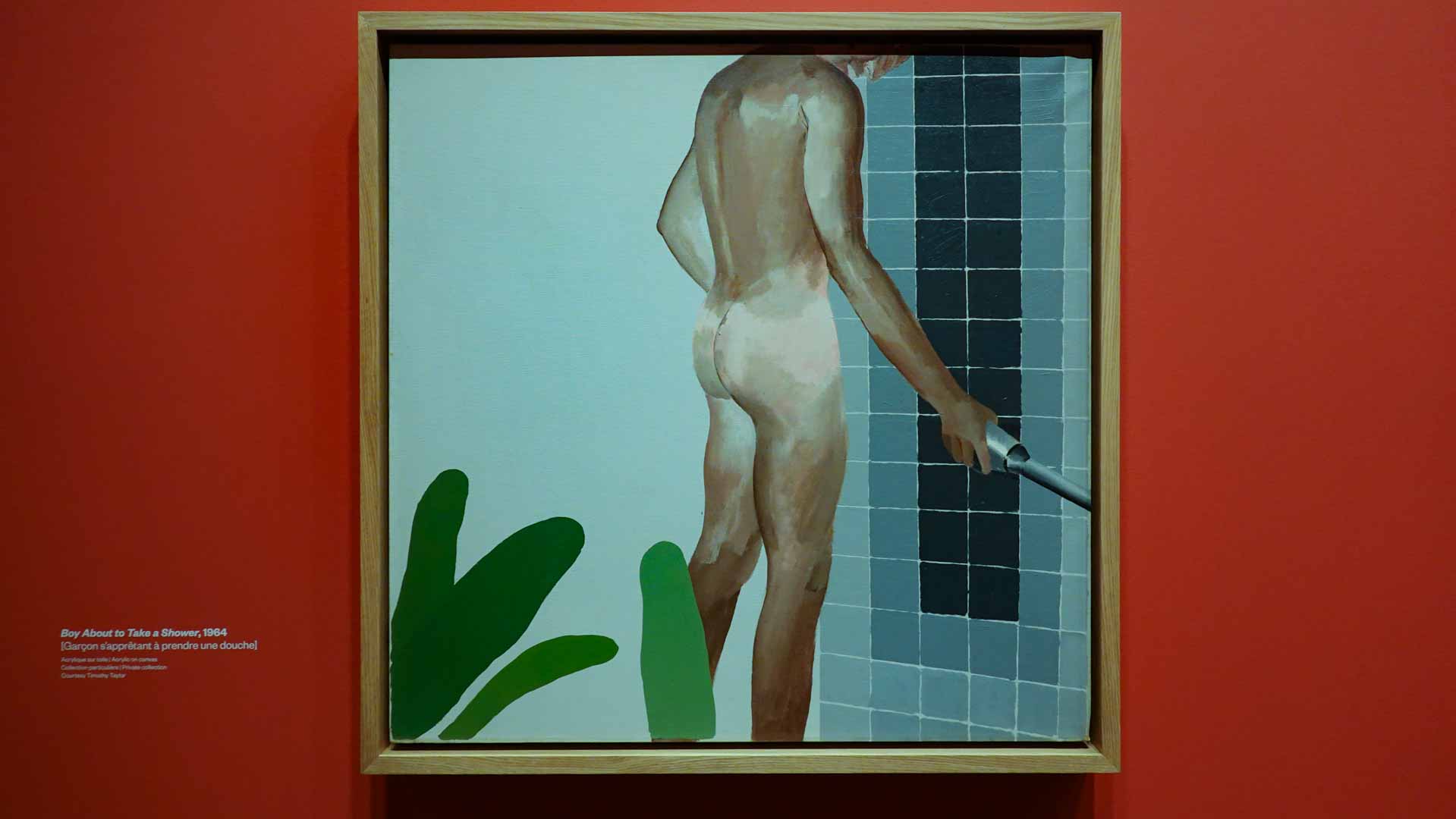 L'exposition débute avec des œuvres de jeunesse, telles que le portrait de son père réalisé en 1955, et des toiles emblématiques des années 1960 abordant l'homosexualité, comme We Two Boys Together Clinging (1961) et Two Men in a Shower (1963). Elle met également en lumière ses célèbres scènes californiennes, notamment A Bigger Splash (1967) et Portrait of an Artist (Pool with Two Figures) (1972), capturant l'esthétique ensoleillée de Los Angeles.