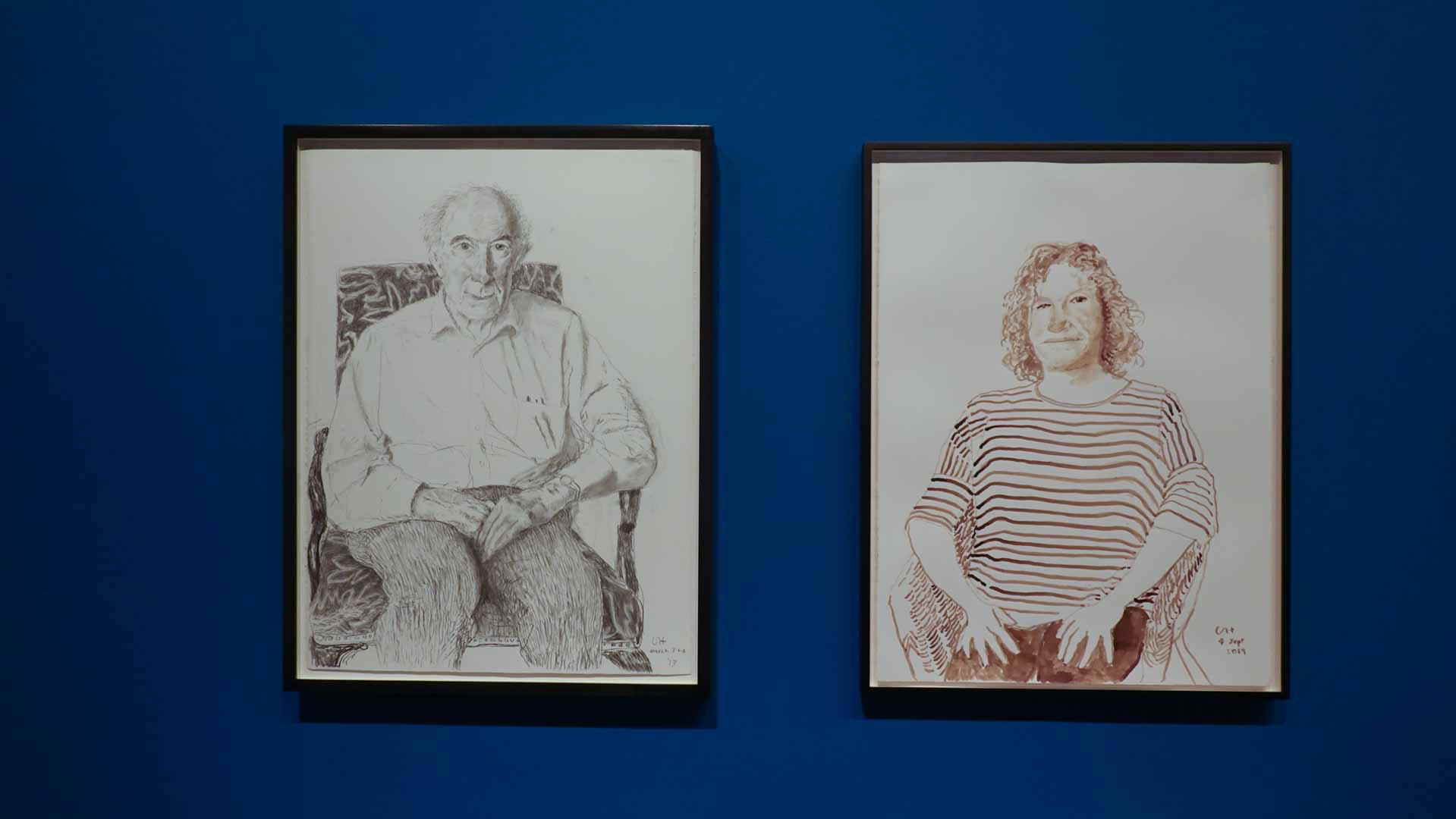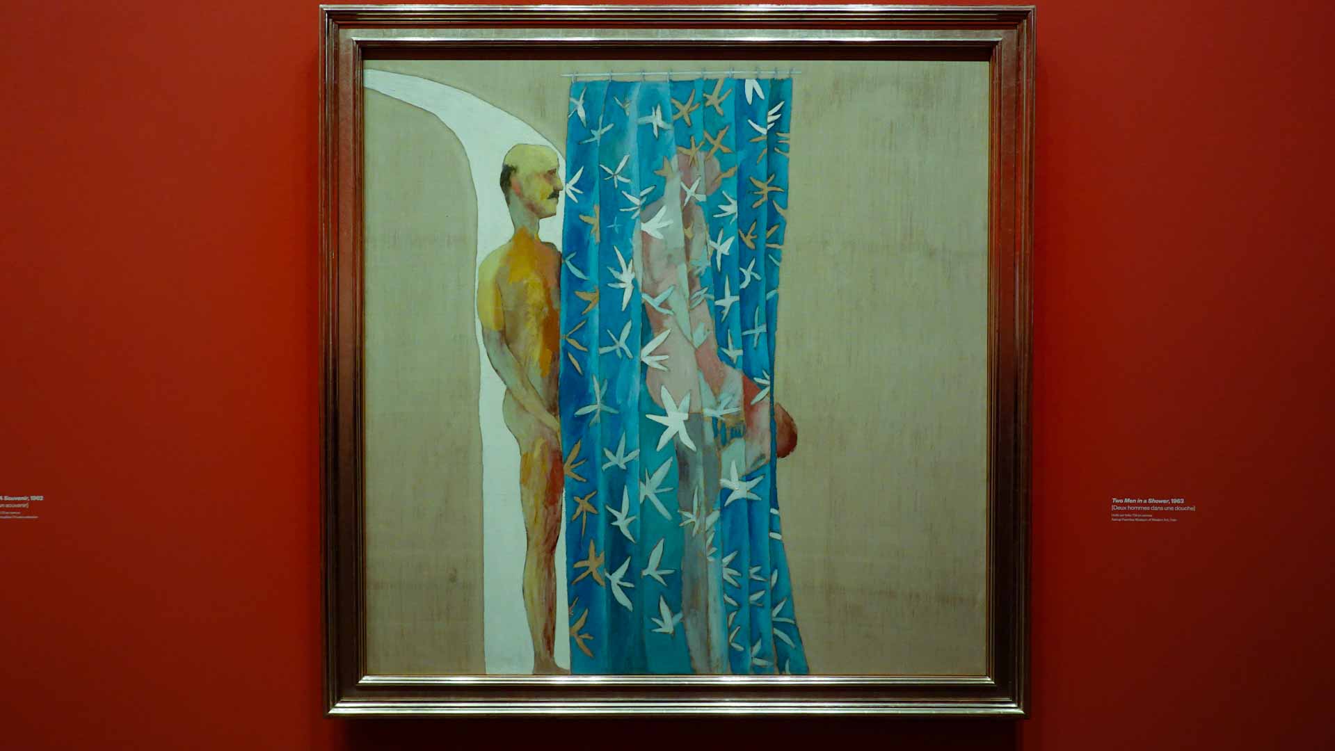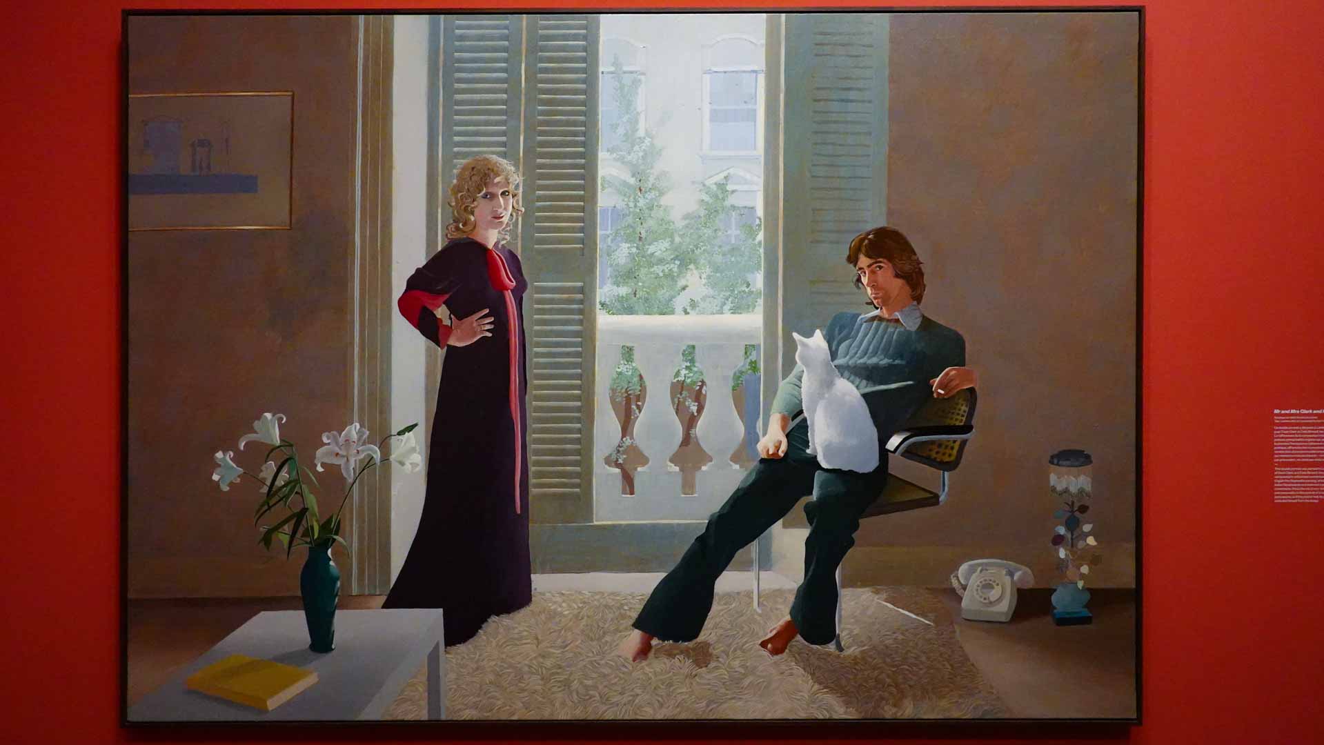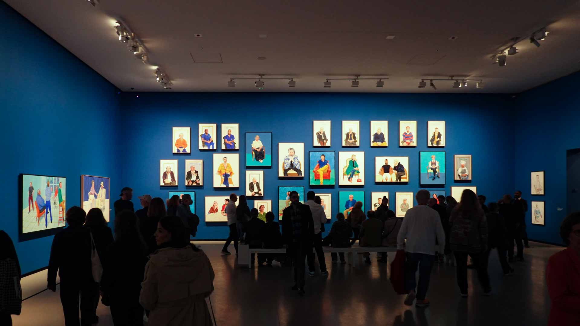 L'exposition débute avec des œuvres de jeunesse, telles que le portrait de son père réalisé en 1955, et des toiles emblématiques des années 1960 abordant l'homosexualité, comme We Two Boys Together Clinging (1961) et Two Men in a Shower (1963). Elle met également en lumière ses célèbres scènes californiennes, notamment A Bigger Splash (1967) et Portrait of an Artist (Pool with Two Figures) (1972), capturant l'esthétique ensoleillée de Los Angeles.