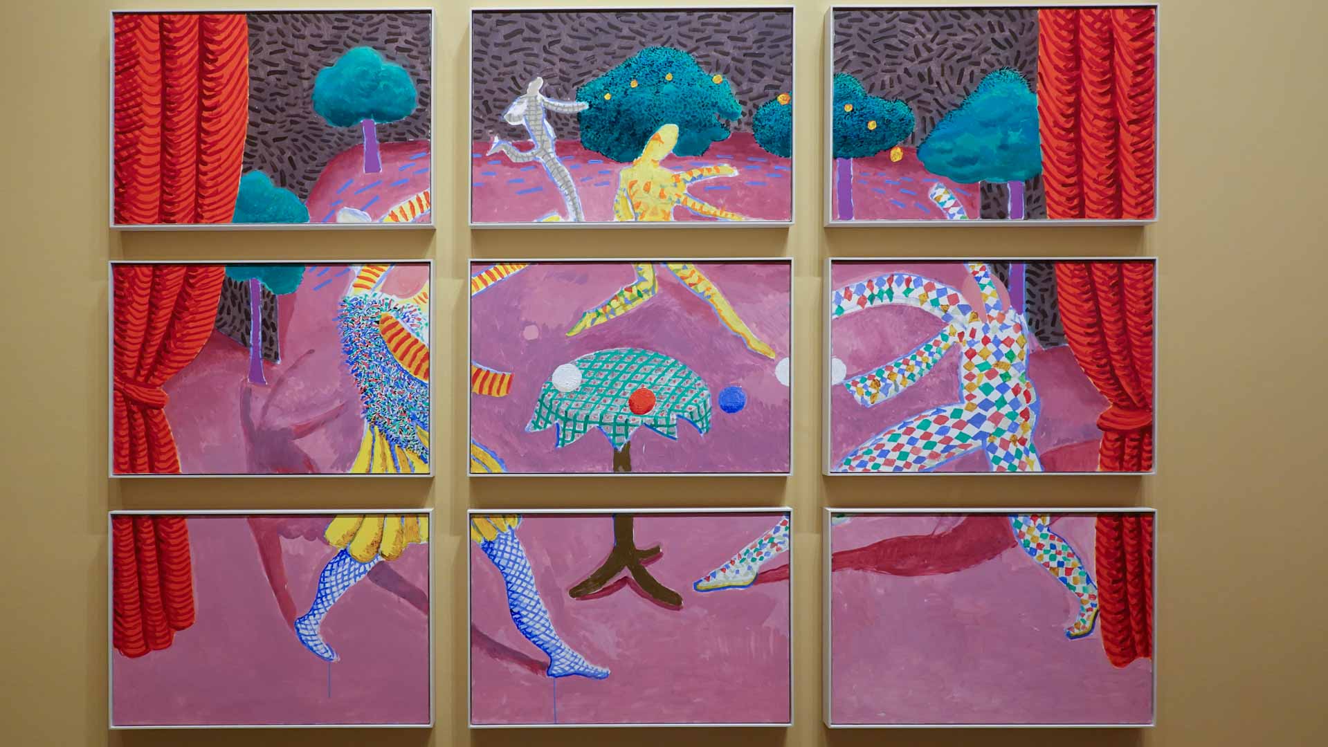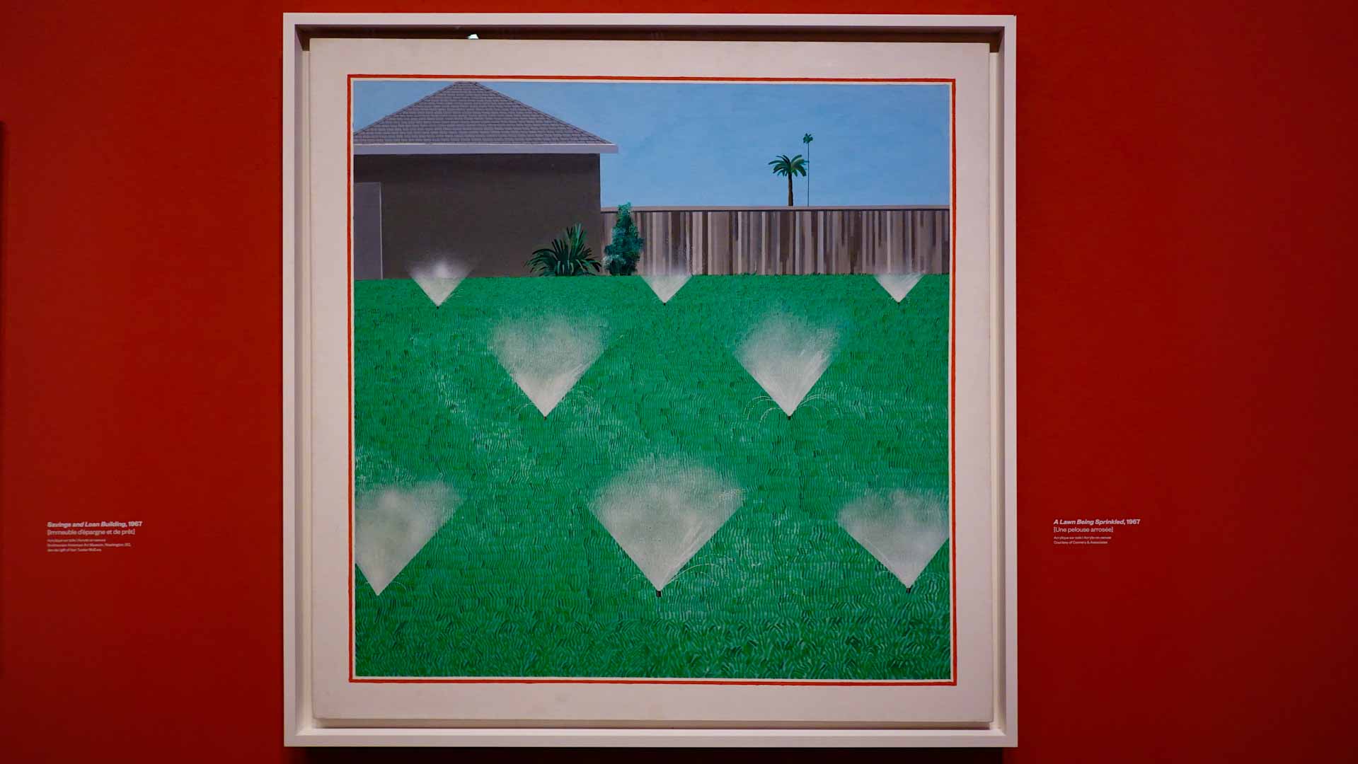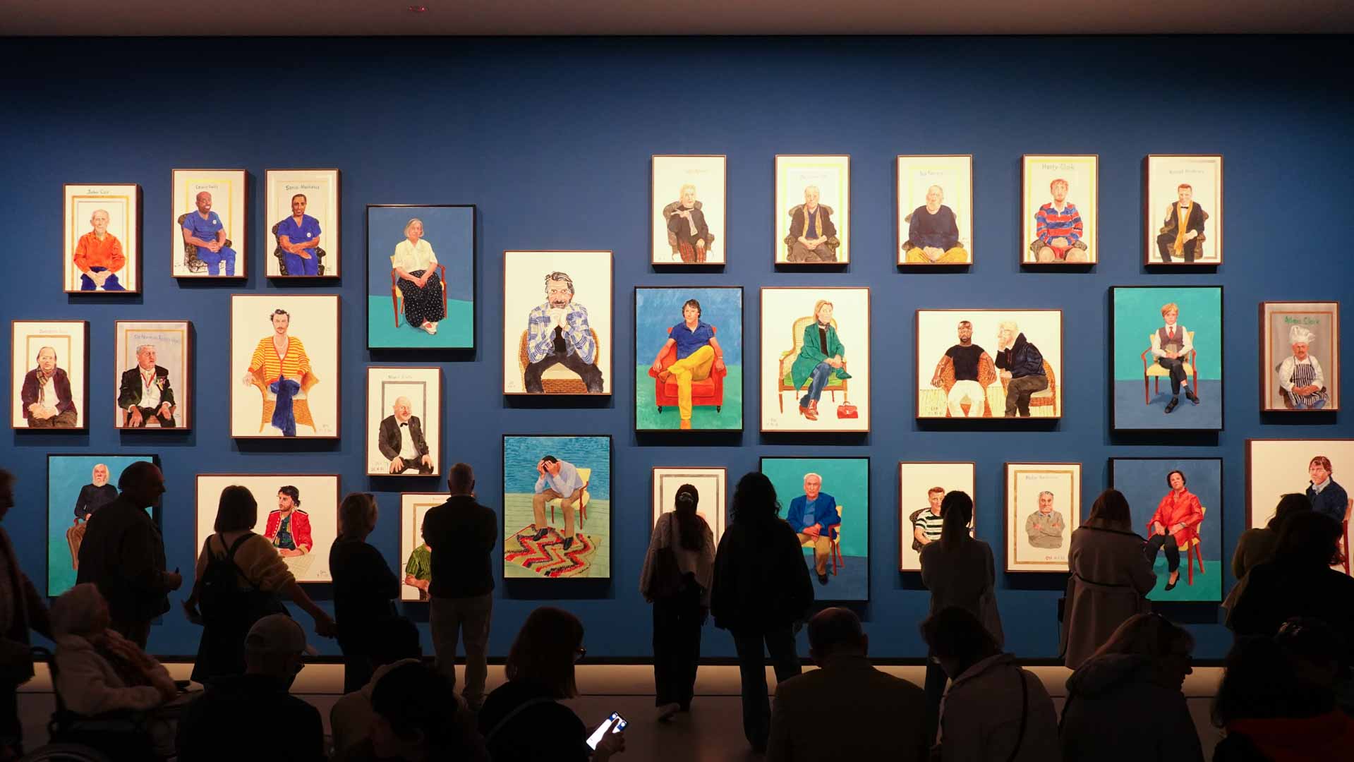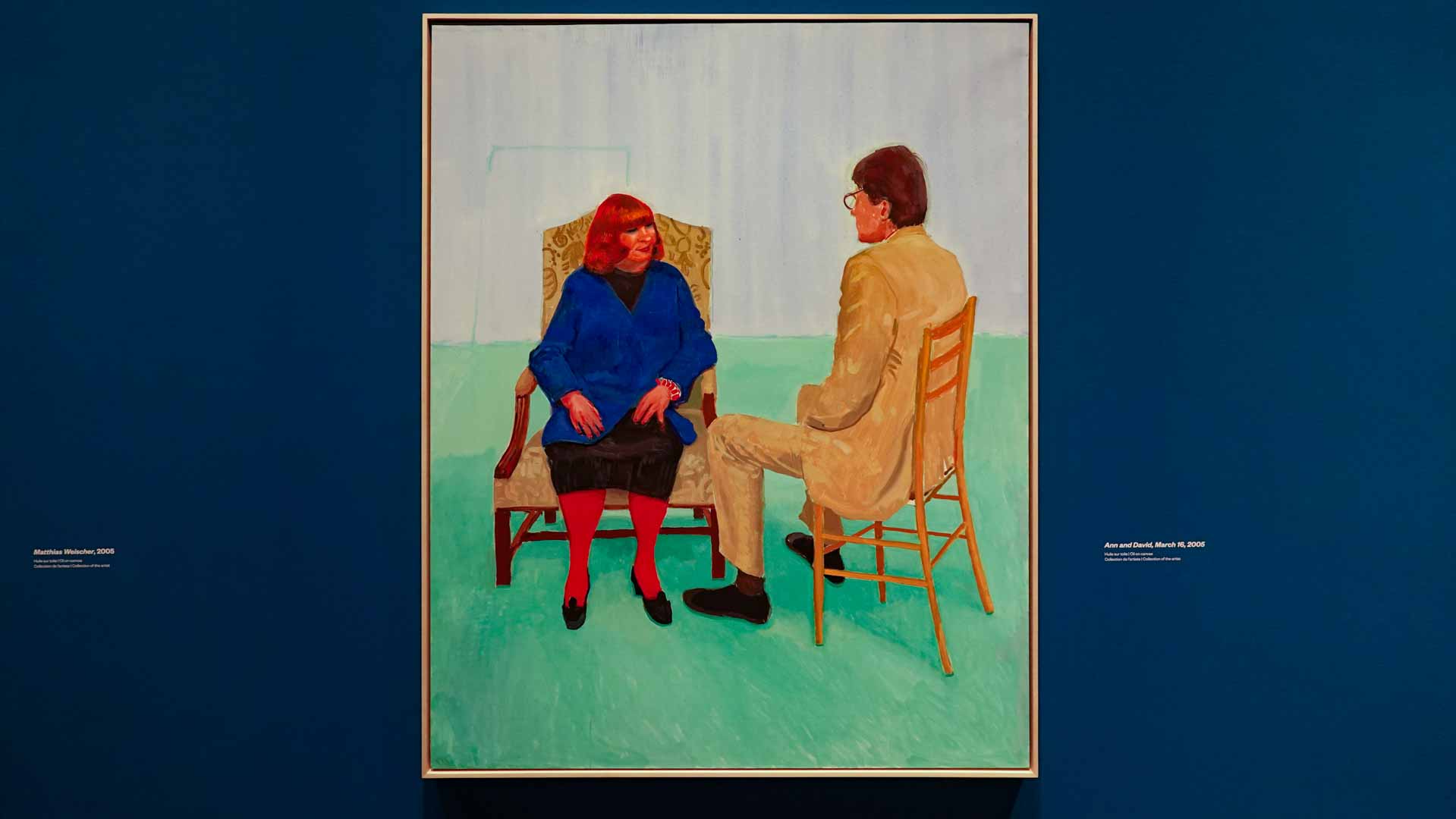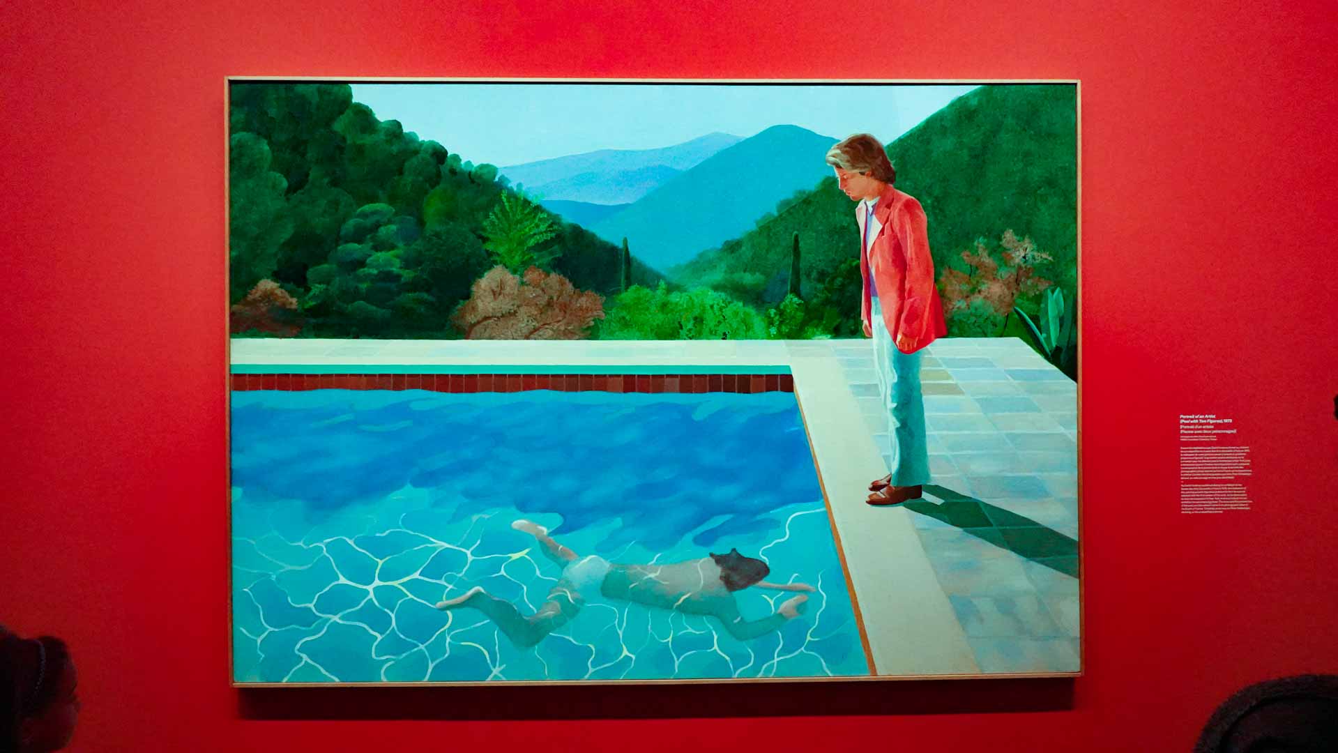 L'exposition débute avec des œuvres de jeunesse, telles que le portrait de son père réalisé en 1955, et des toiles emblématiques des années 1960 abordant l'homosexualité, comme We Two Boys Together Clinging (1961) et Two Men in a Shower (1963). Elle met également en lumière ses célèbres scènes californiennes, notamment A Bigger Splash (1967) et Portrait of an Artist (Pool with Two Figures) (1972), capturant l'esthétique ensoleillée de Los Angeles.