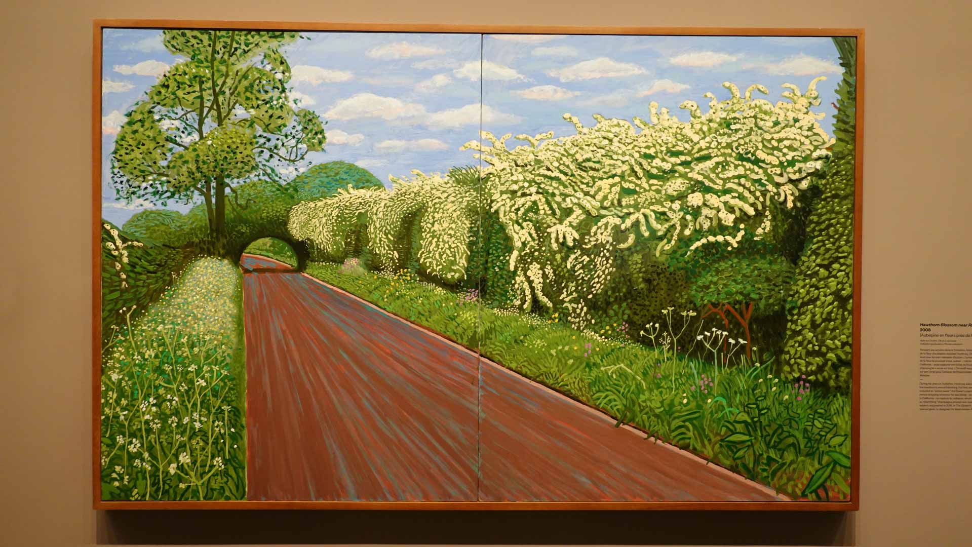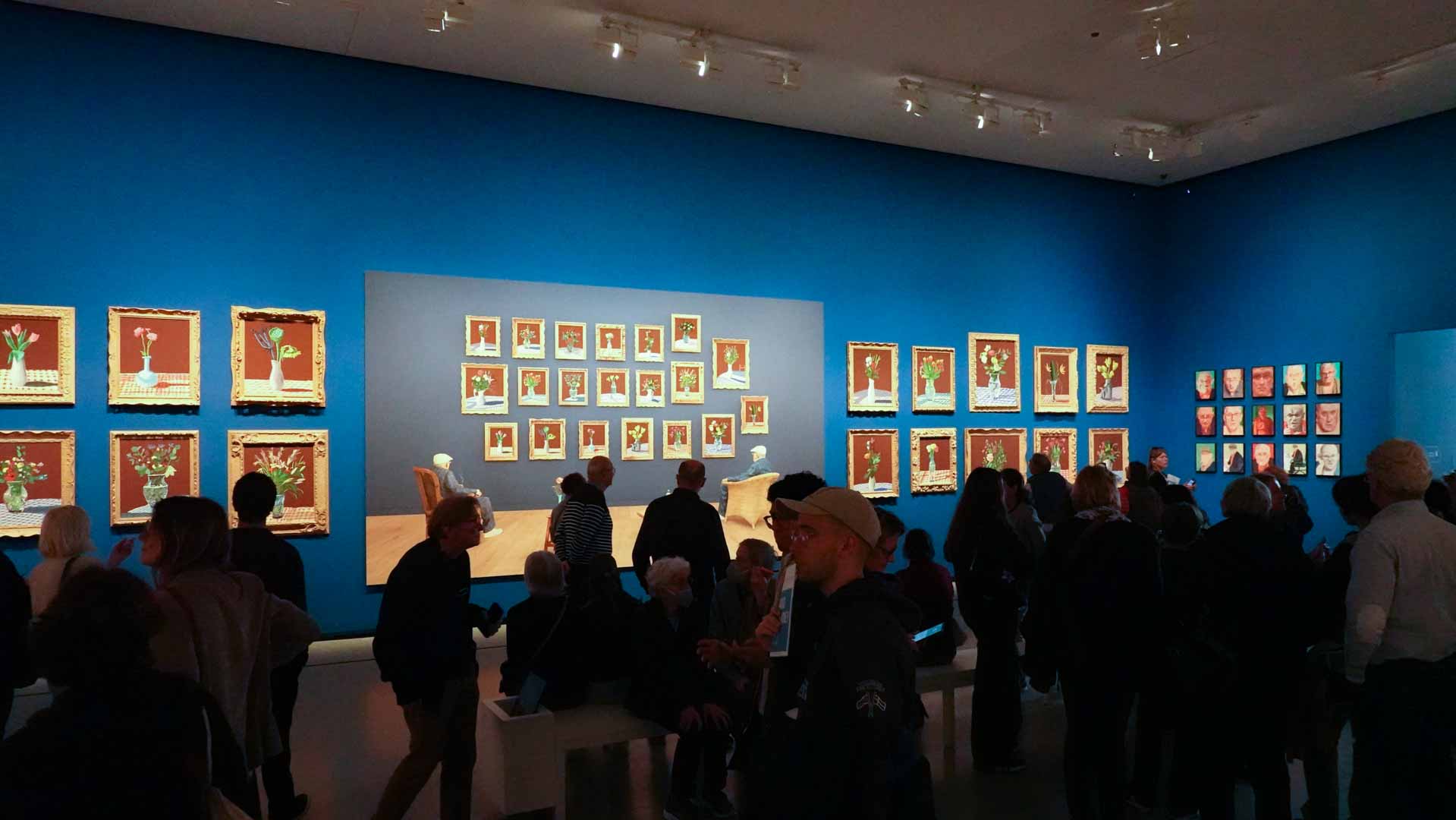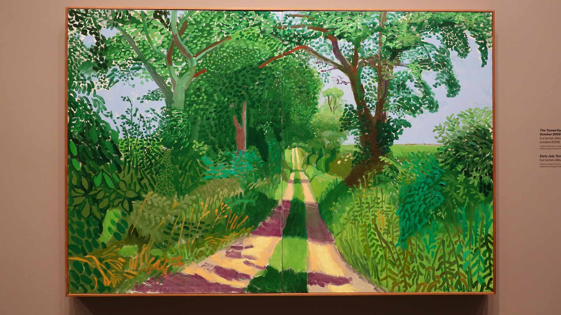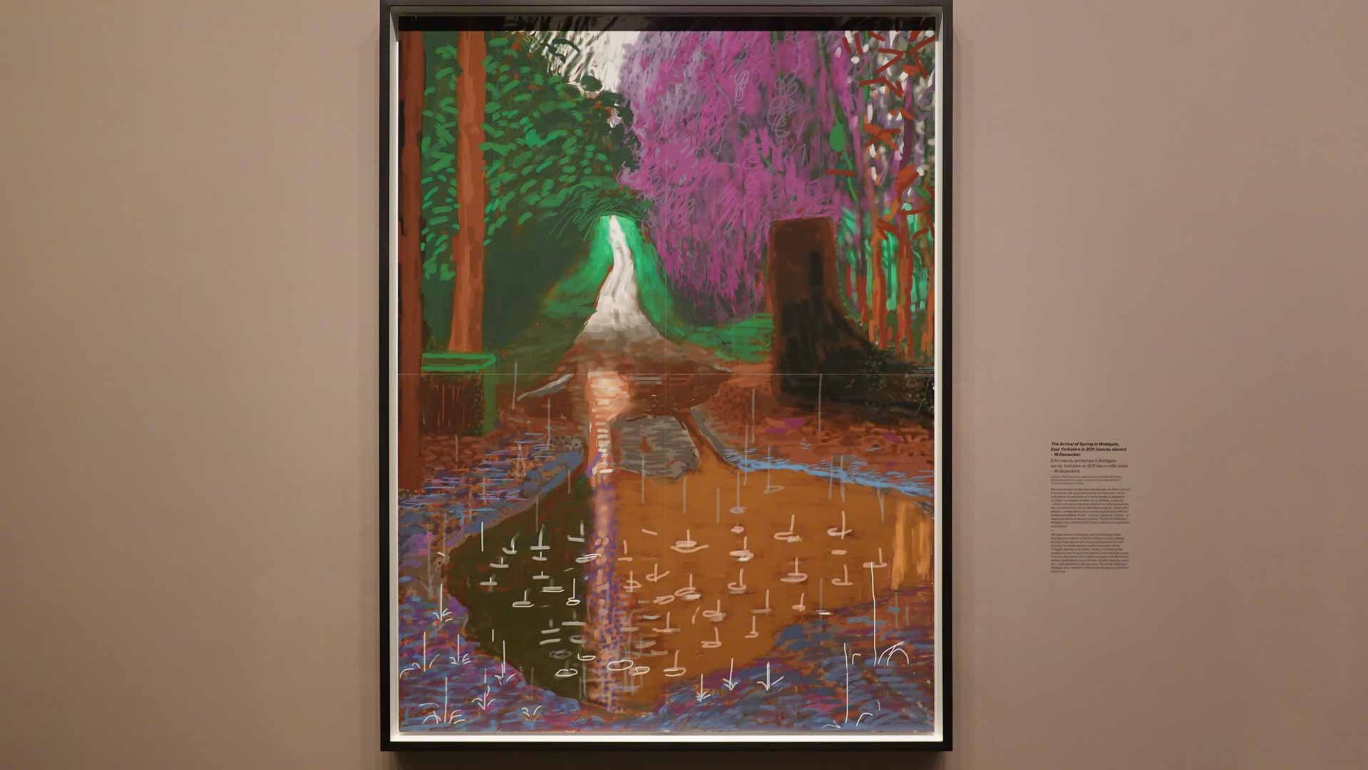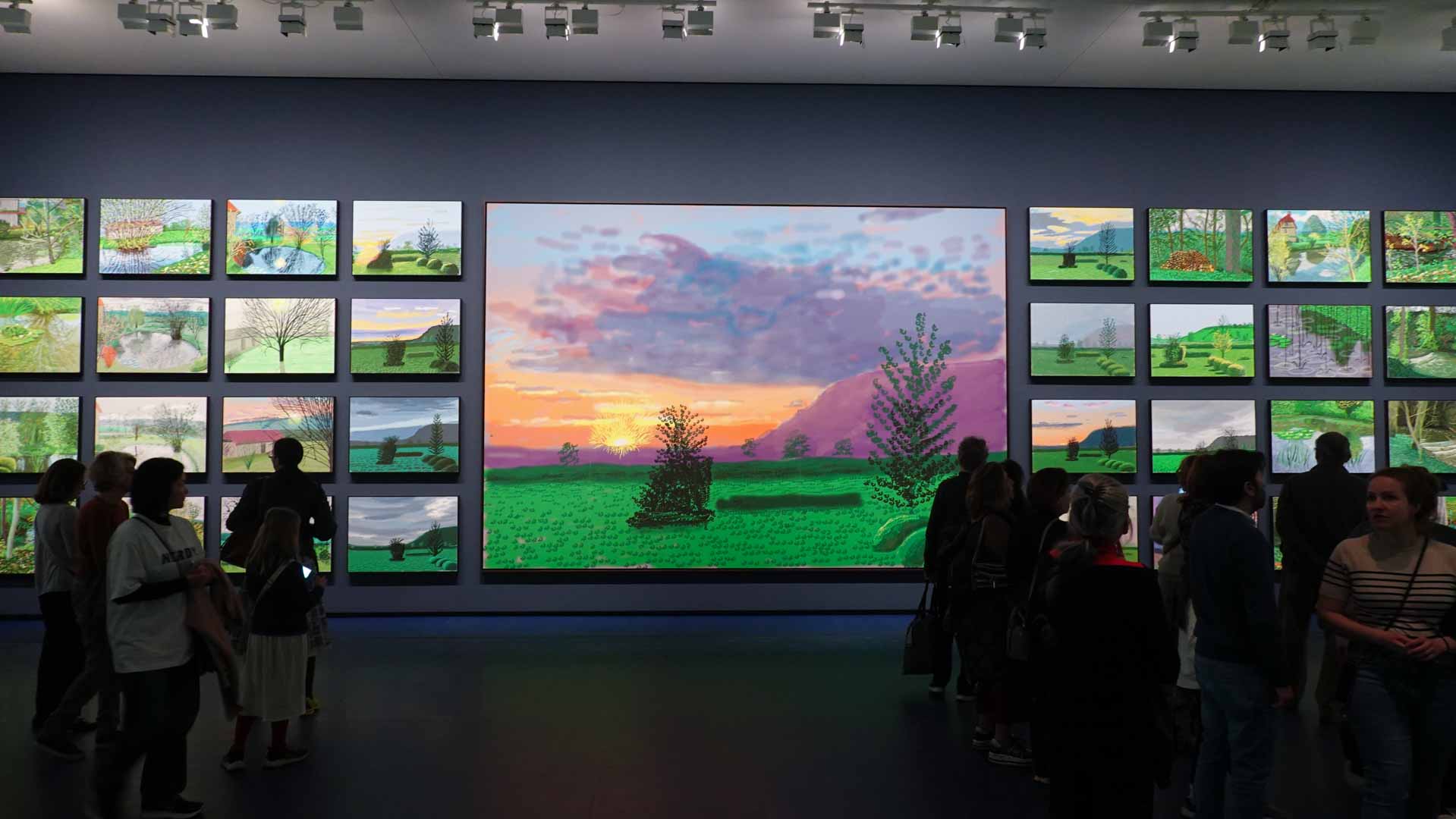 La rétrospective accorde une attention particulière aux œuvres des 25 dernières années, période marquée par une exploration intense du paysage et de la technologie. Parmi les pièces majeures, on retrouve Bigger Trees Near Warter (2007), une composition monumentale de 50 toiles représentant la campagne du Yorkshire, et A Year in Normandie (2020), une frise numérique de 90 mètres inspirée de la tapisserie de Bayeux. Durant le confinement, Hockney a également réalisé plus de 200 dessins sur iPad, capturant la floraison printanière de son jardin normand.