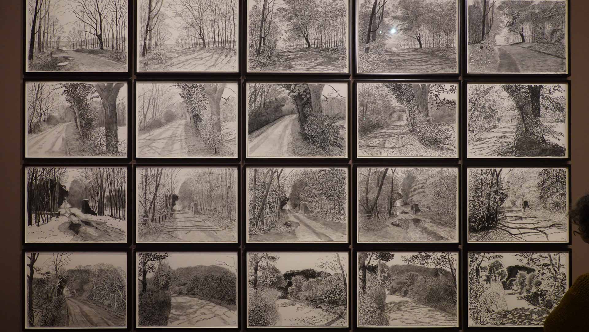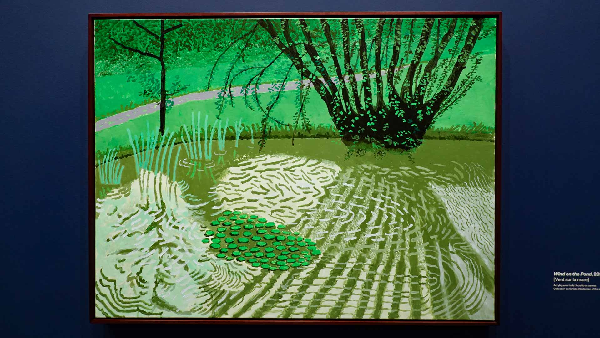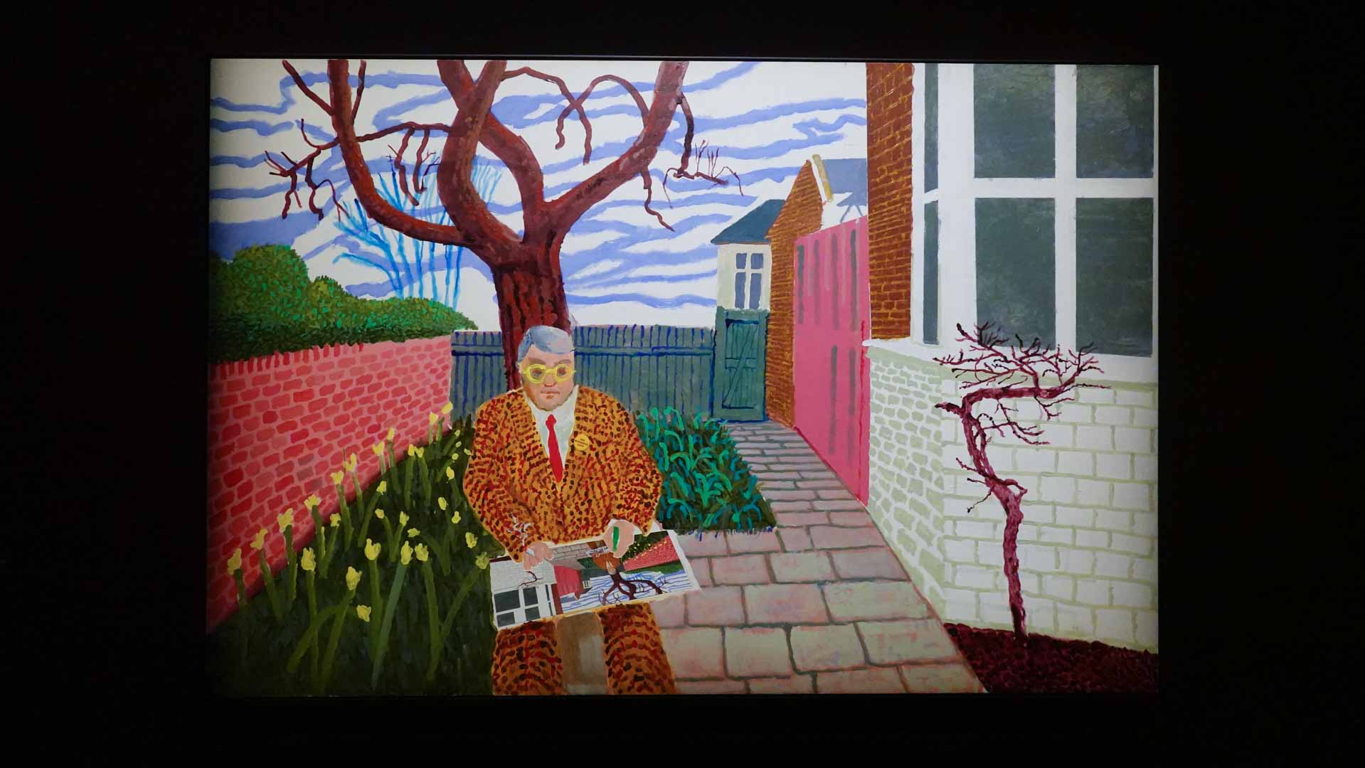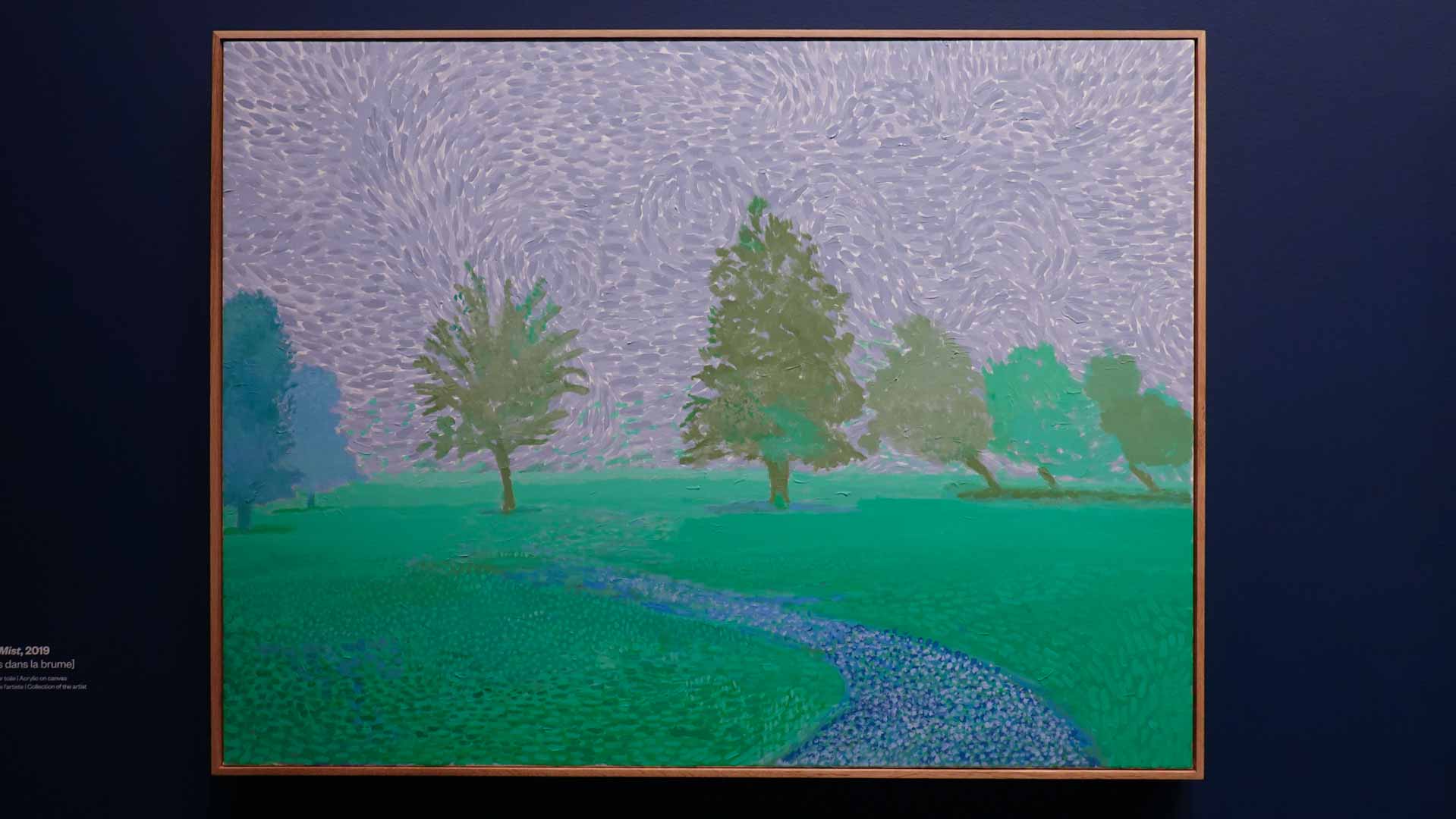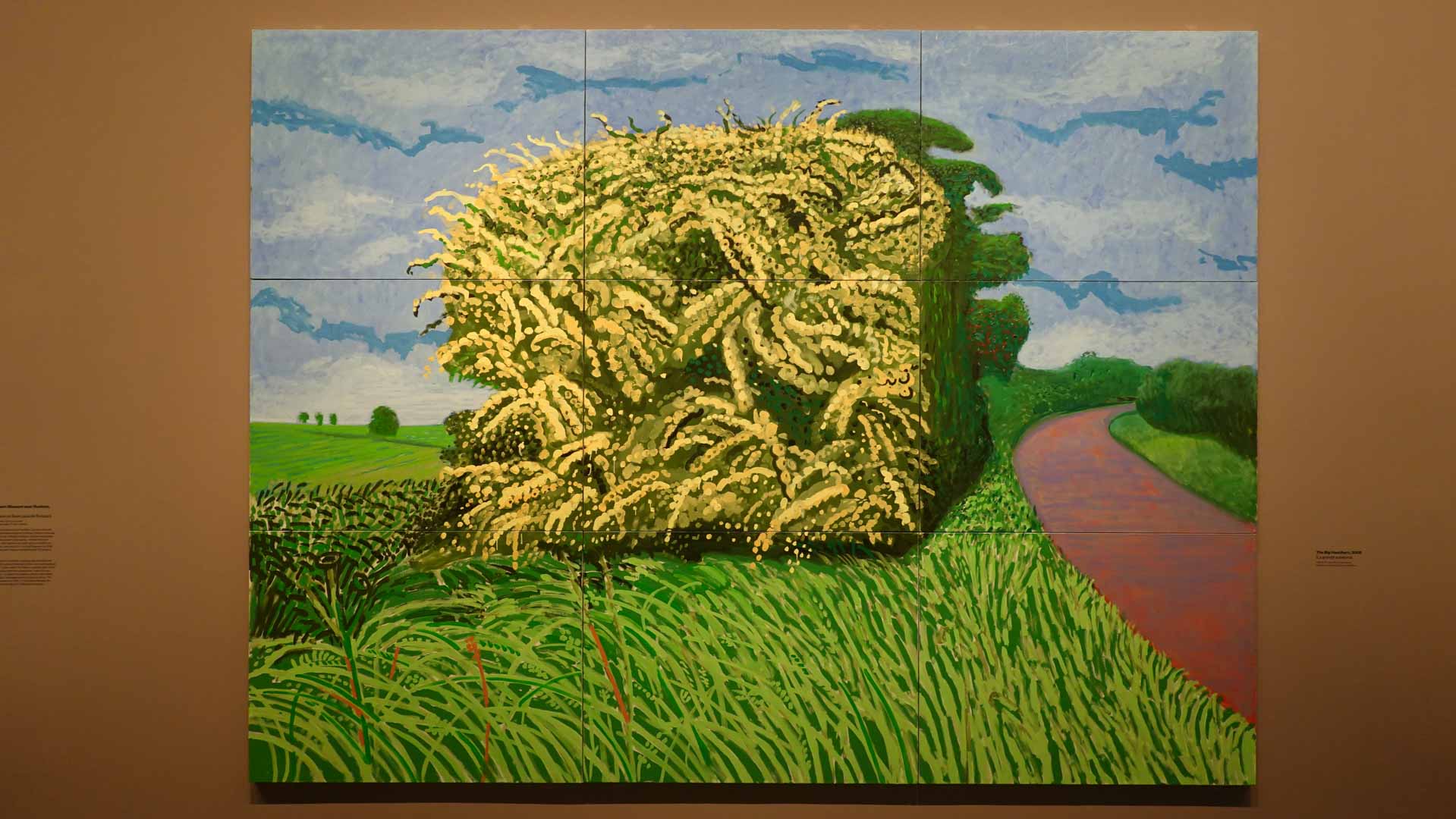 La rétrospective accorde une attention particulière aux œuvres des 25 dernières années, période marquée par une exploration intense du paysage et de la technologie. Parmi les pièces majeures, on retrouve Bigger Trees Near Warter (2007), une composition monumentale de 50 toiles représentant la campagne du Yorkshire, et A Year in Normandie (2020), une frise numérique de 90 mètres inspirée de la tapisserie de Bayeux. Durant le confinement, Hockney a également réalisé plus de 200 dessins sur iPad, capturant la floraison printanière de son jardin normand.