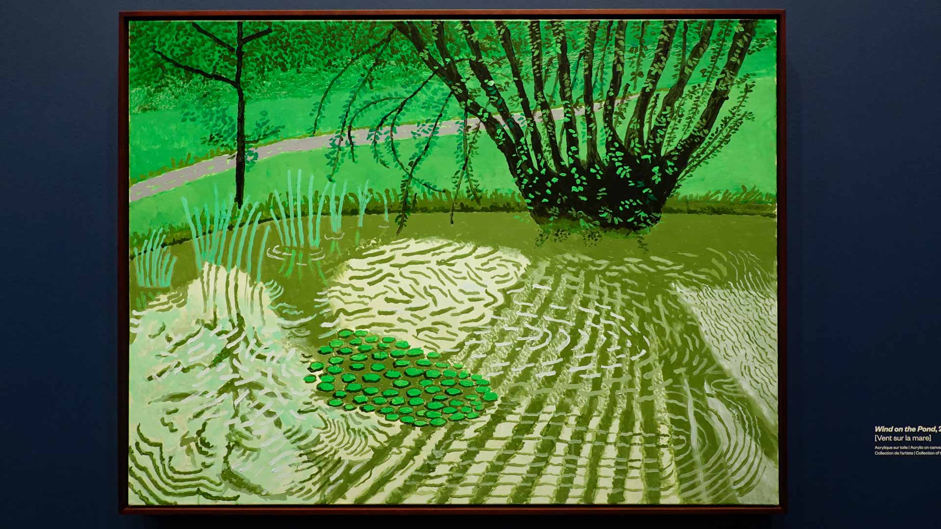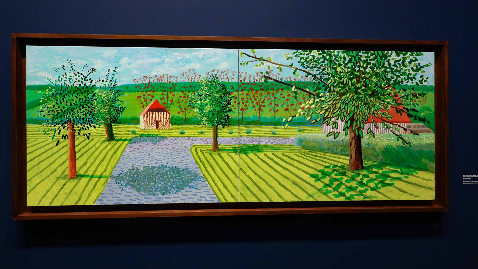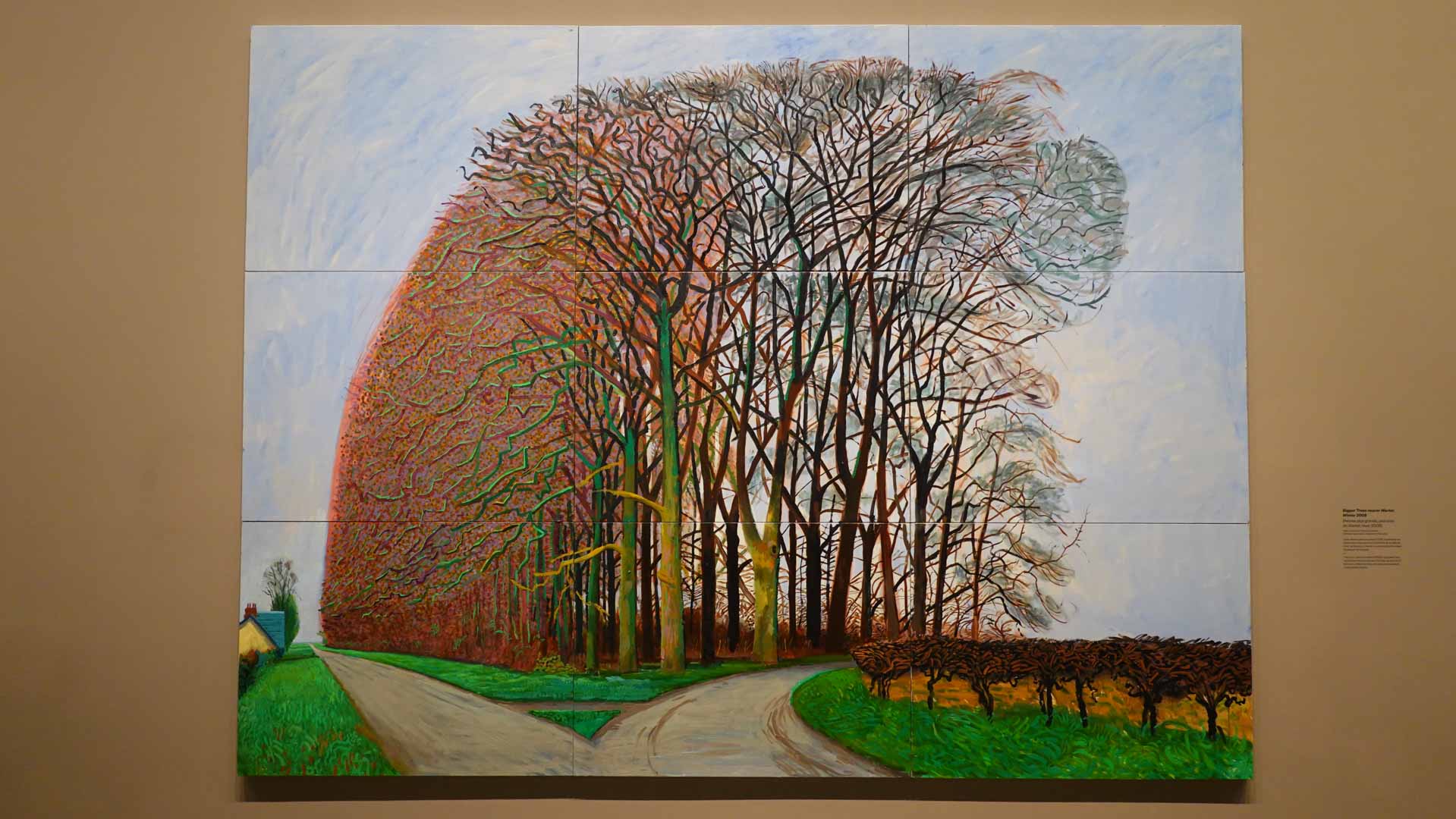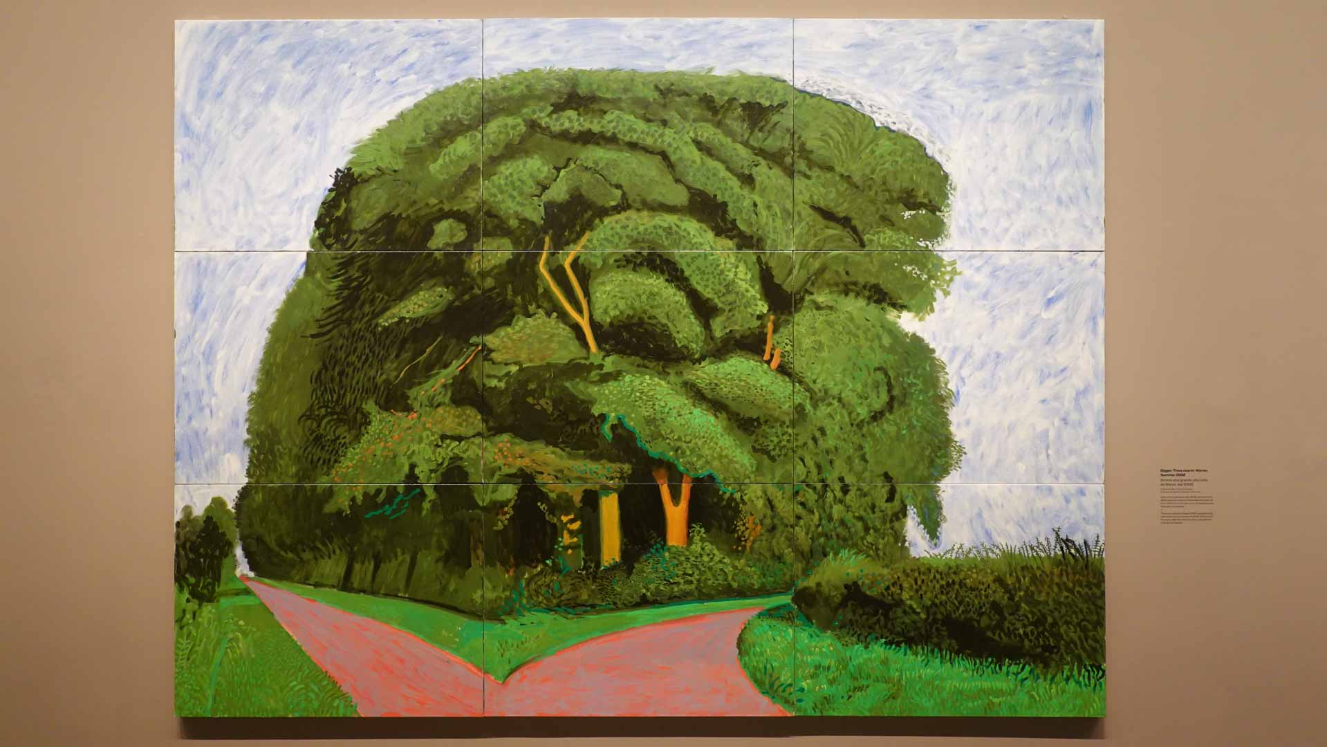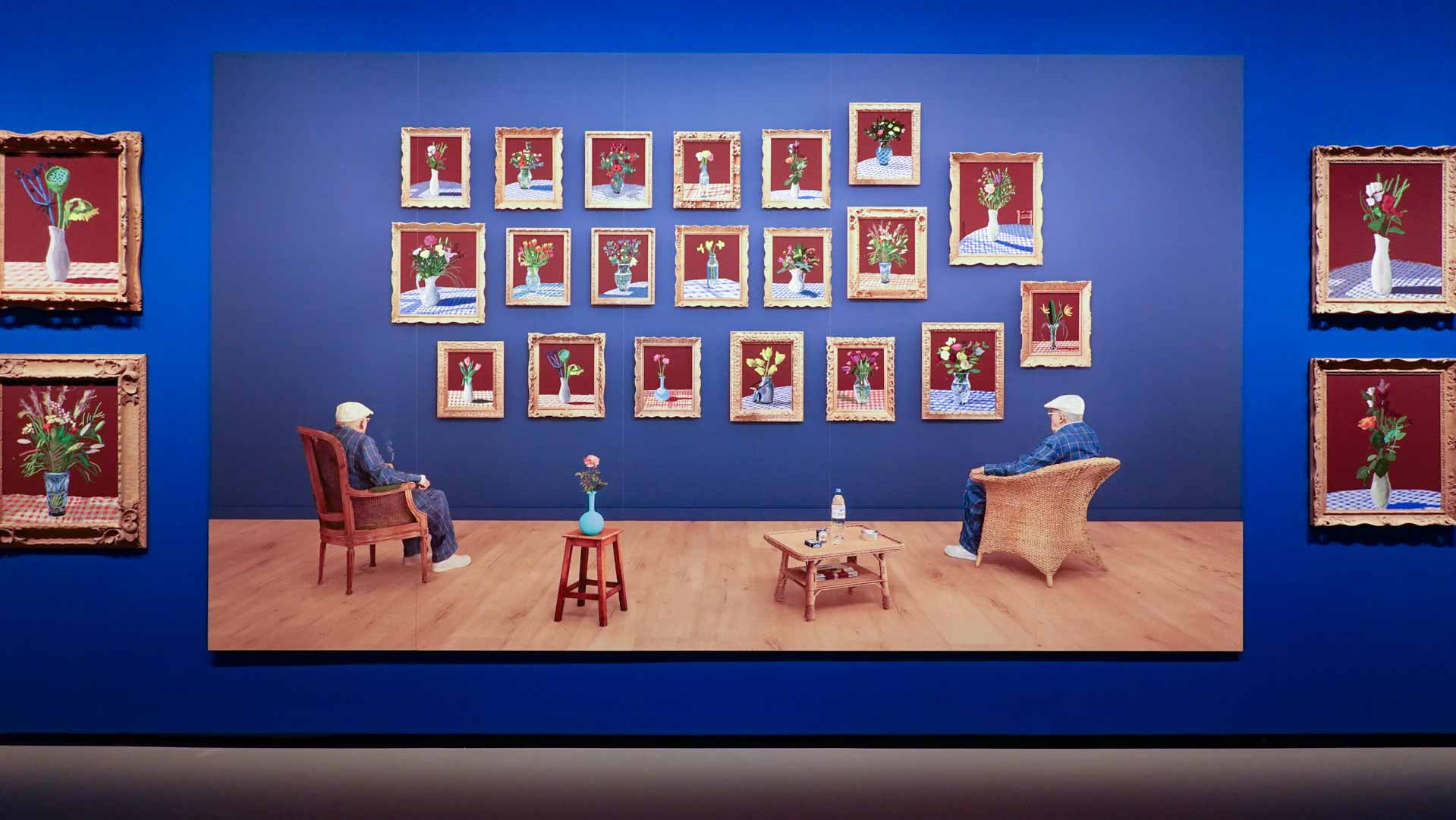 La rétrospective accorde une attention particulière aux œuvres des 25 dernières années, période marquée par une exploration intense du paysage et de la technologie. Parmi les pièces majeures, on retrouve Bigger Trees Near Warter (2007), une composition monumentale de 50 toiles représentant la campagne du Yorkshire, et A Year in Normandie (2020), une frise numérique de 90 mètres inspirée de la tapisserie de Bayeux. Durant le confinement, Hockney a également réalisé plus de 200 dessins sur iPad, capturant la floraison printanière de son jardin normand.