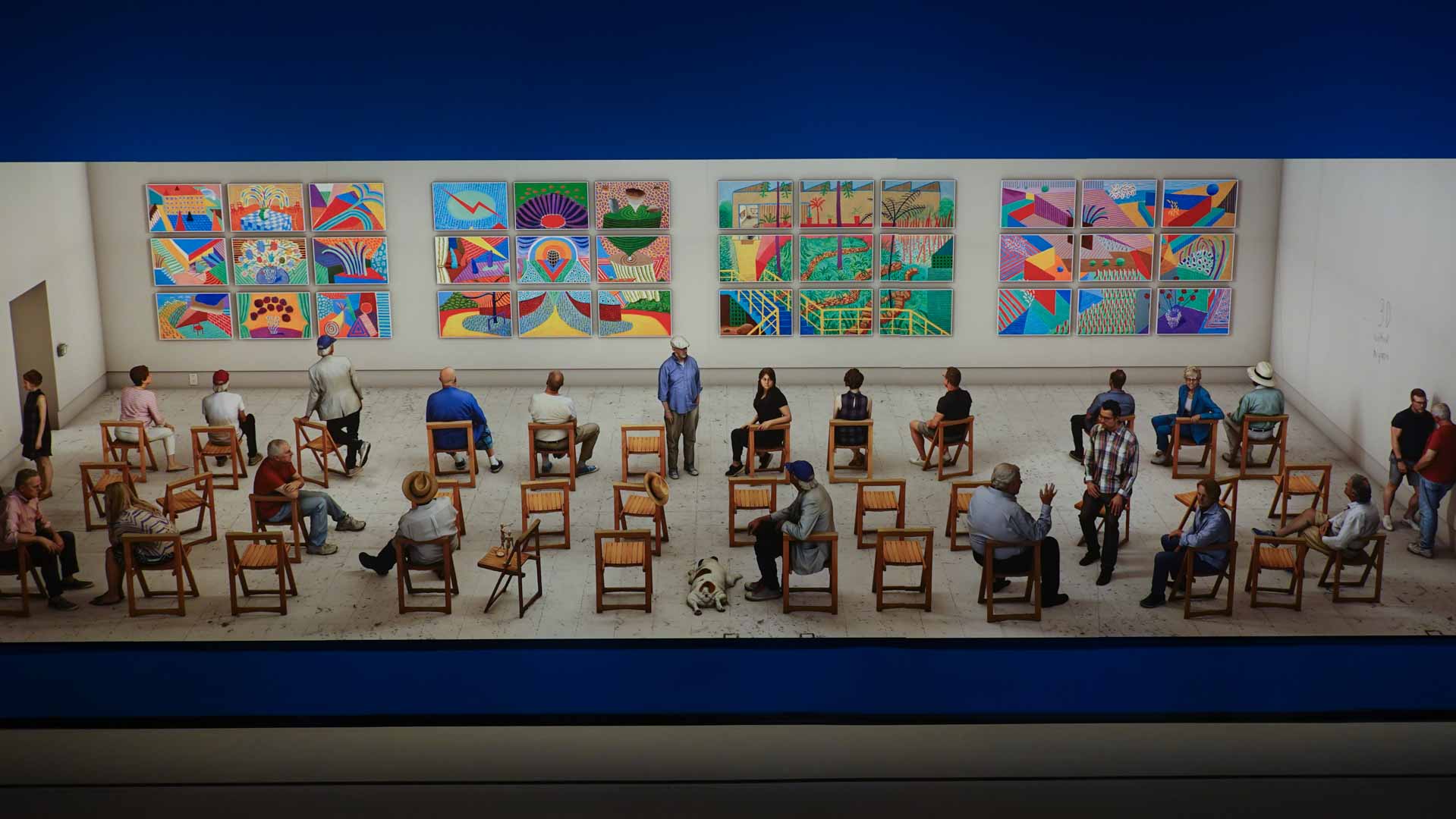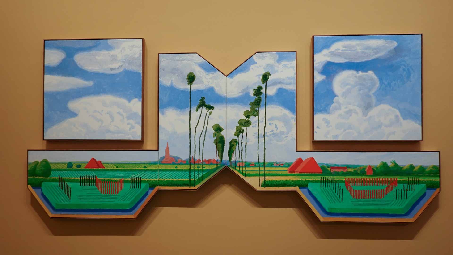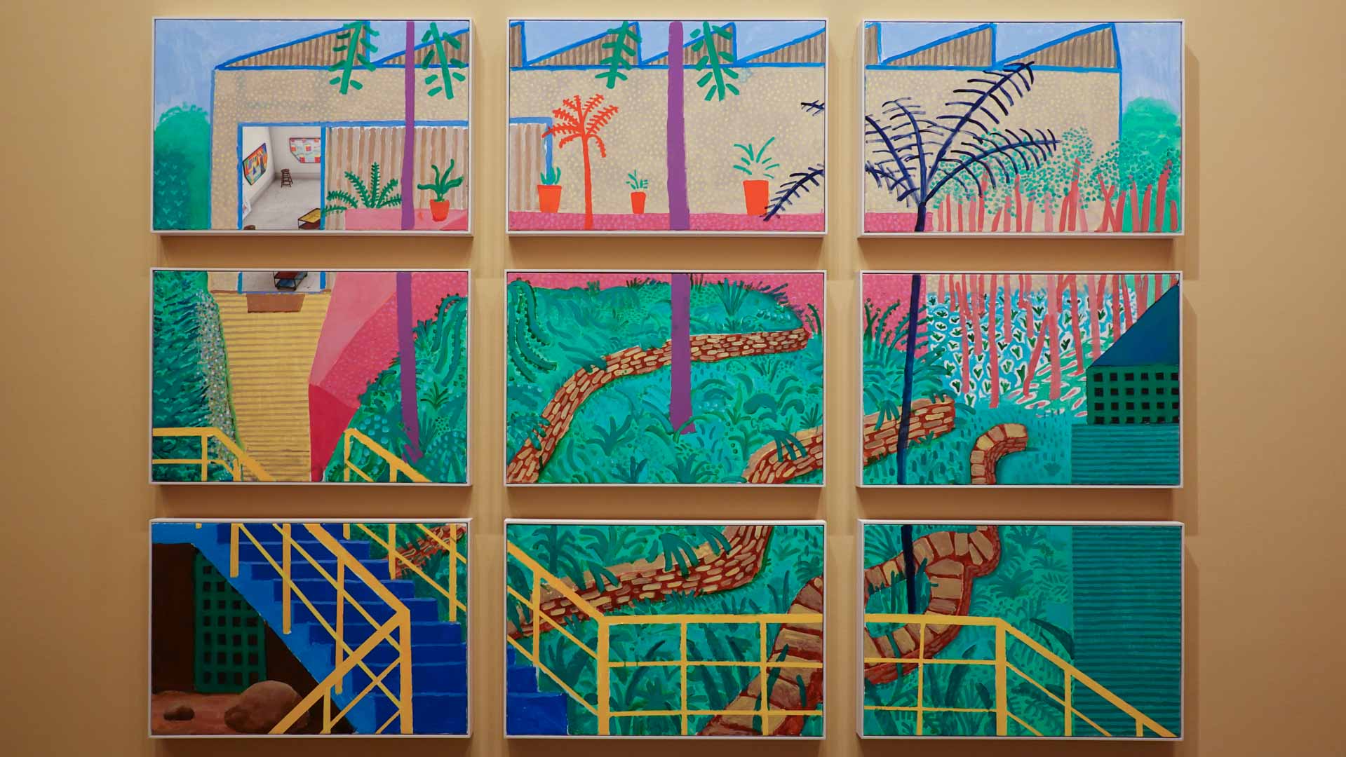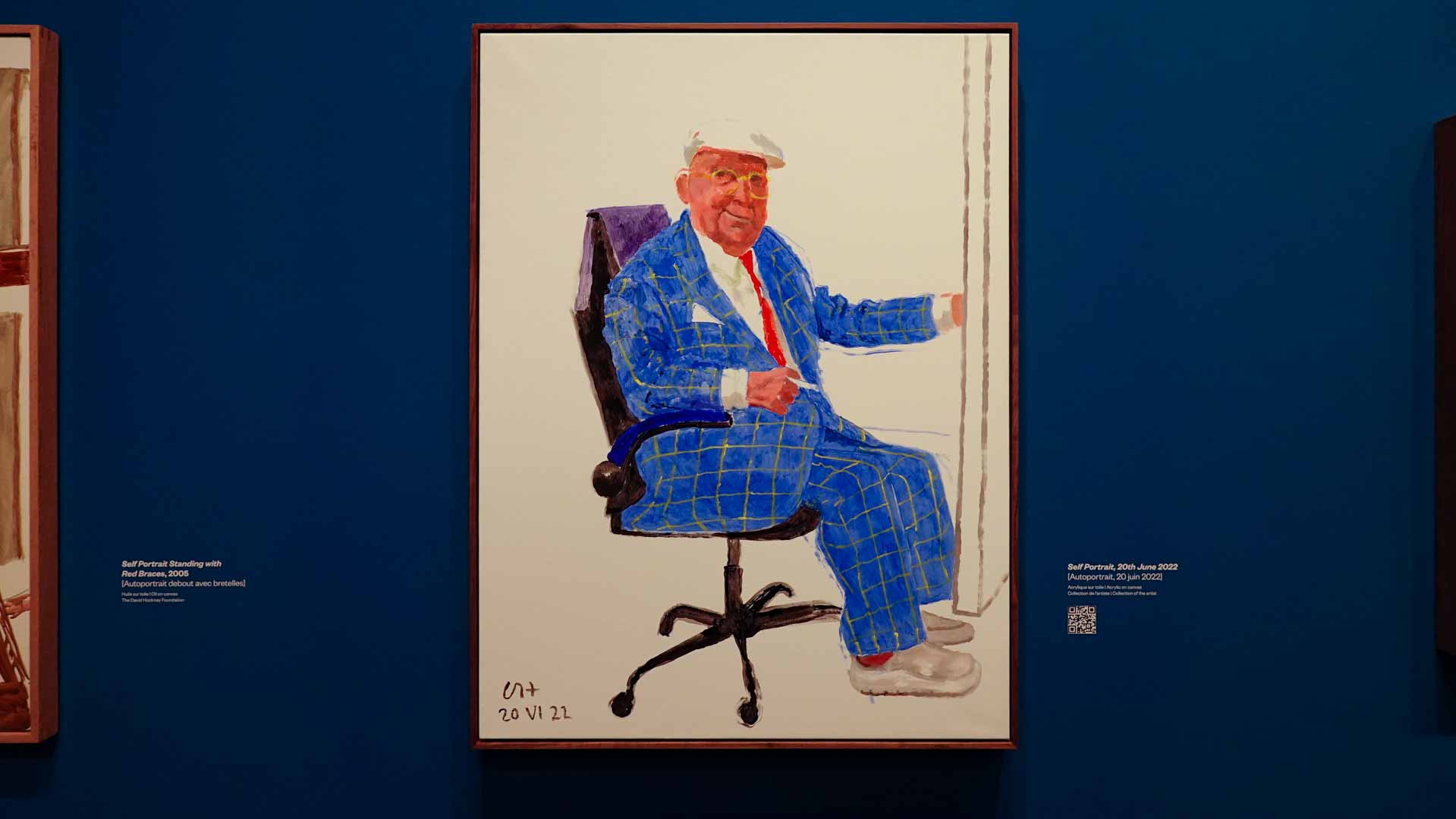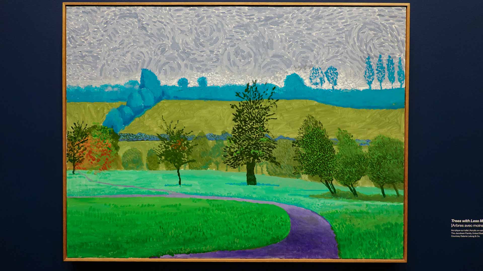 La rétrospective accorde une attention particulière aux œuvres des 25 dernières années, période marquée par une exploration intense du paysage et de la technologie. Parmi les pièces majeures, on retrouve Bigger Trees Near Warter (2007), une composition monumentale de 50 toiles représentant la campagne du Yorkshire, et A Year in Normandie (2020), une frise numérique de 90 mètres inspirée de la tapisserie de Bayeux. Durant le confinement, Hockney a également réalisé plus de 200 dessins sur iPad, capturant la floraison printanière de son jardin normand.