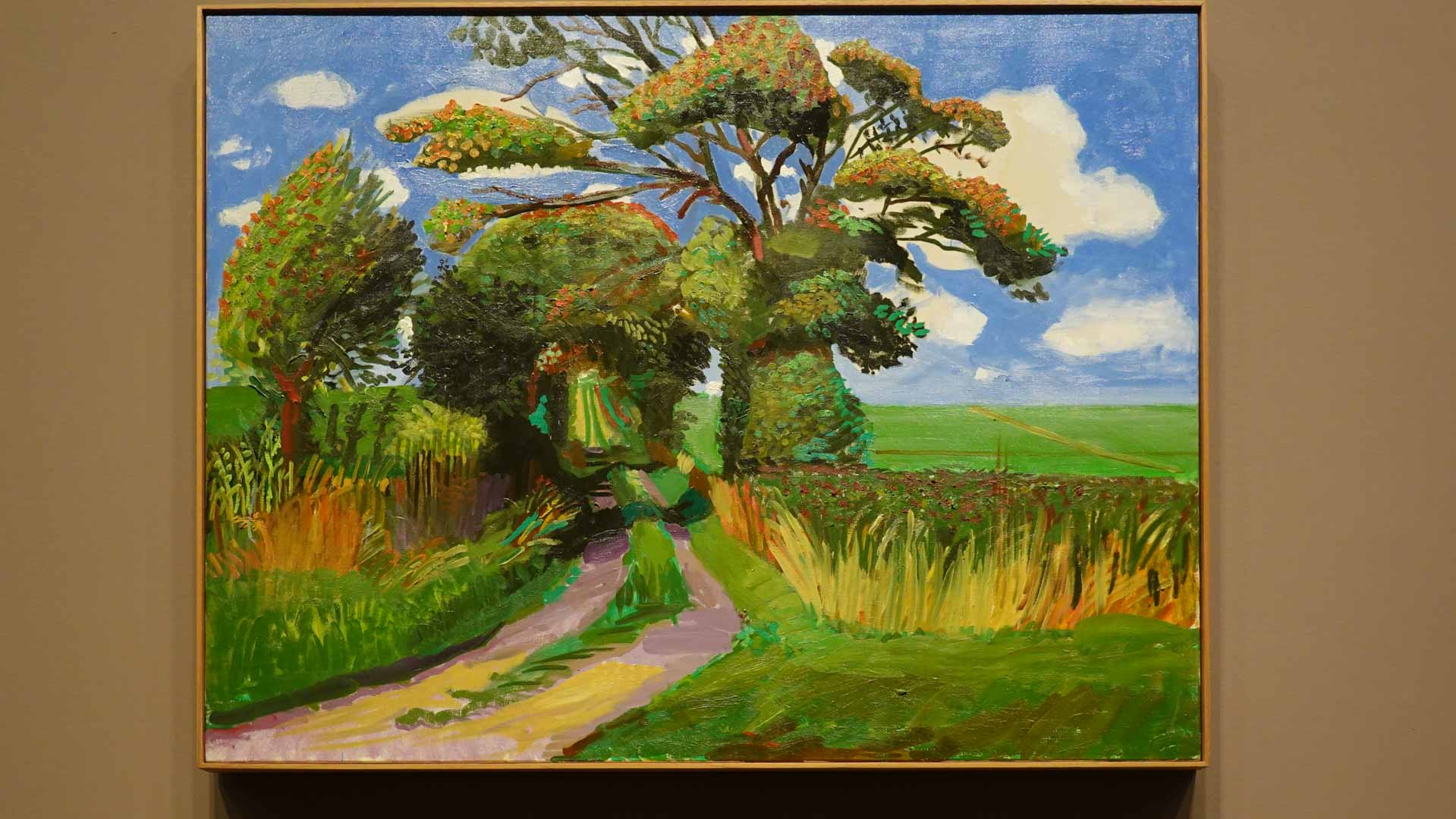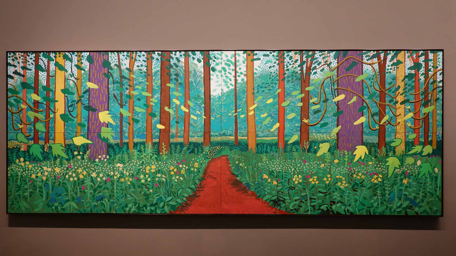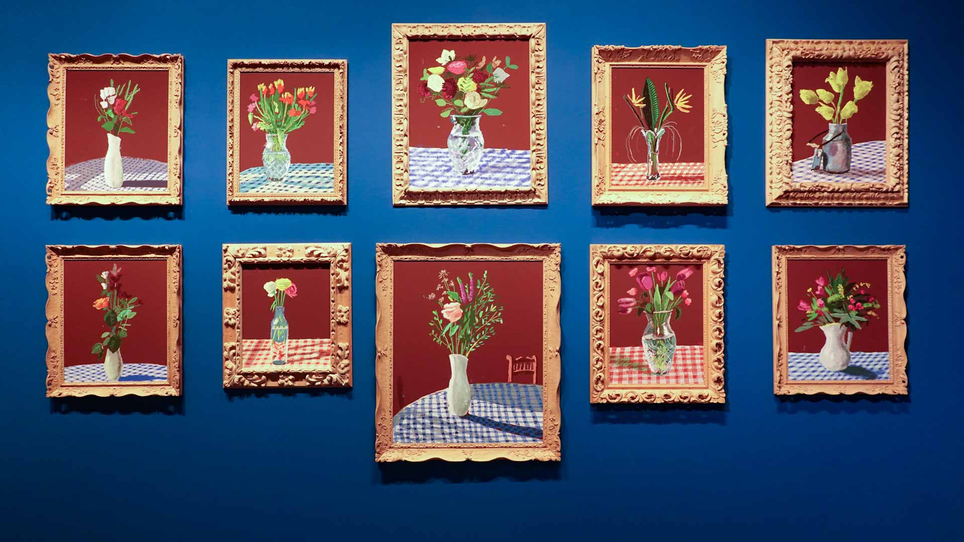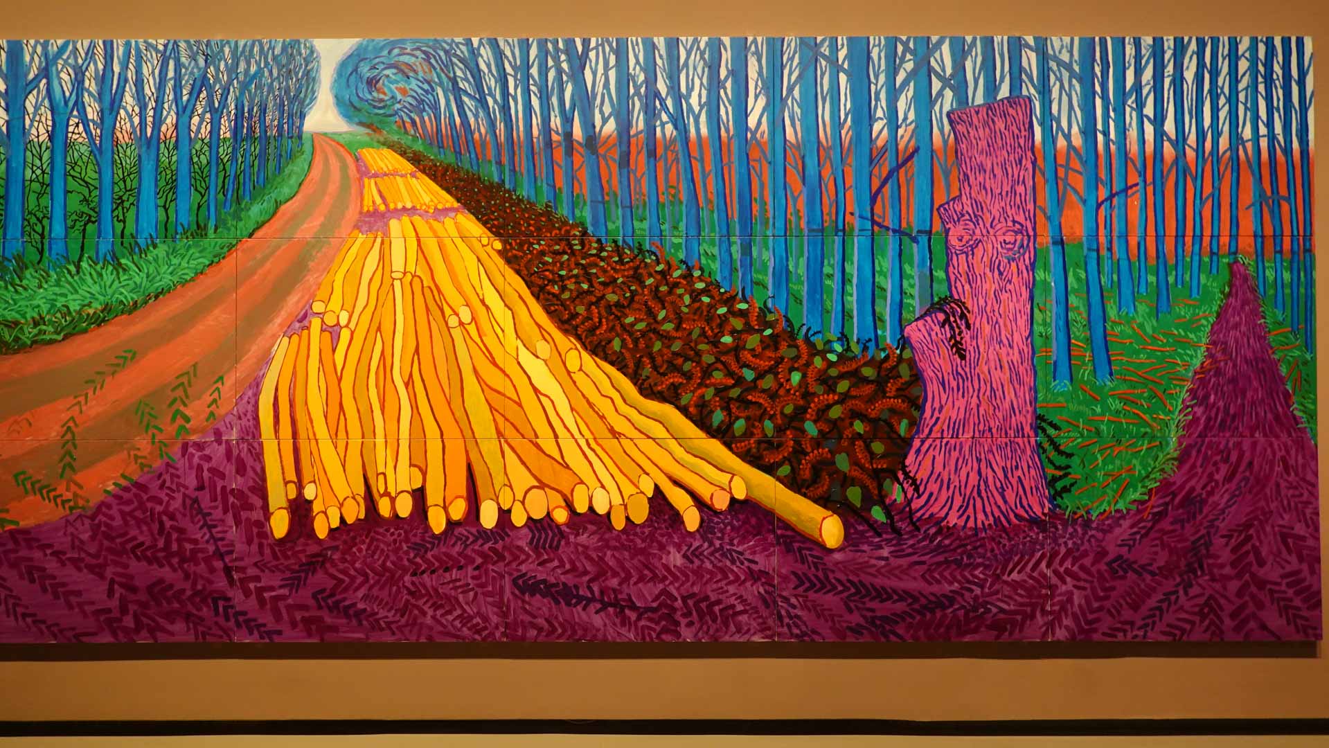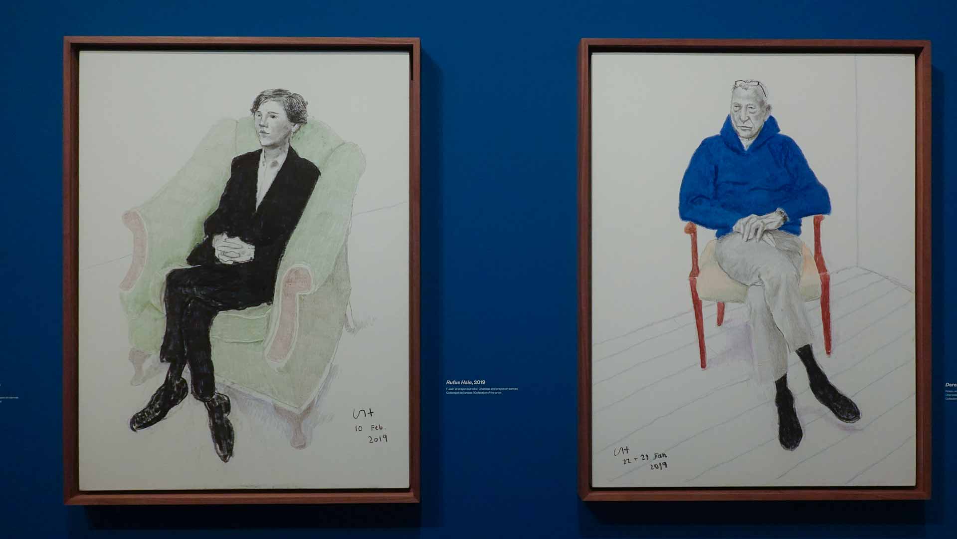 La rétrospective accorde une attention particulière aux œuvres des 25 dernières années, période marquée par une exploration intense du paysage et de la technologie. Parmi les pièces majeures, on retrouve Bigger Trees Near Warter (2007), une composition monumentale de 50 toiles représentant la campagne du Yorkshire, et A Year in Normandie (2020), une frise numérique de 90 mètres inspirée de la tapisserie de Bayeux. Durant le confinement, Hockney a également réalisé plus de 200 dessins sur iPad, capturant la floraison printanière de son jardin normand.