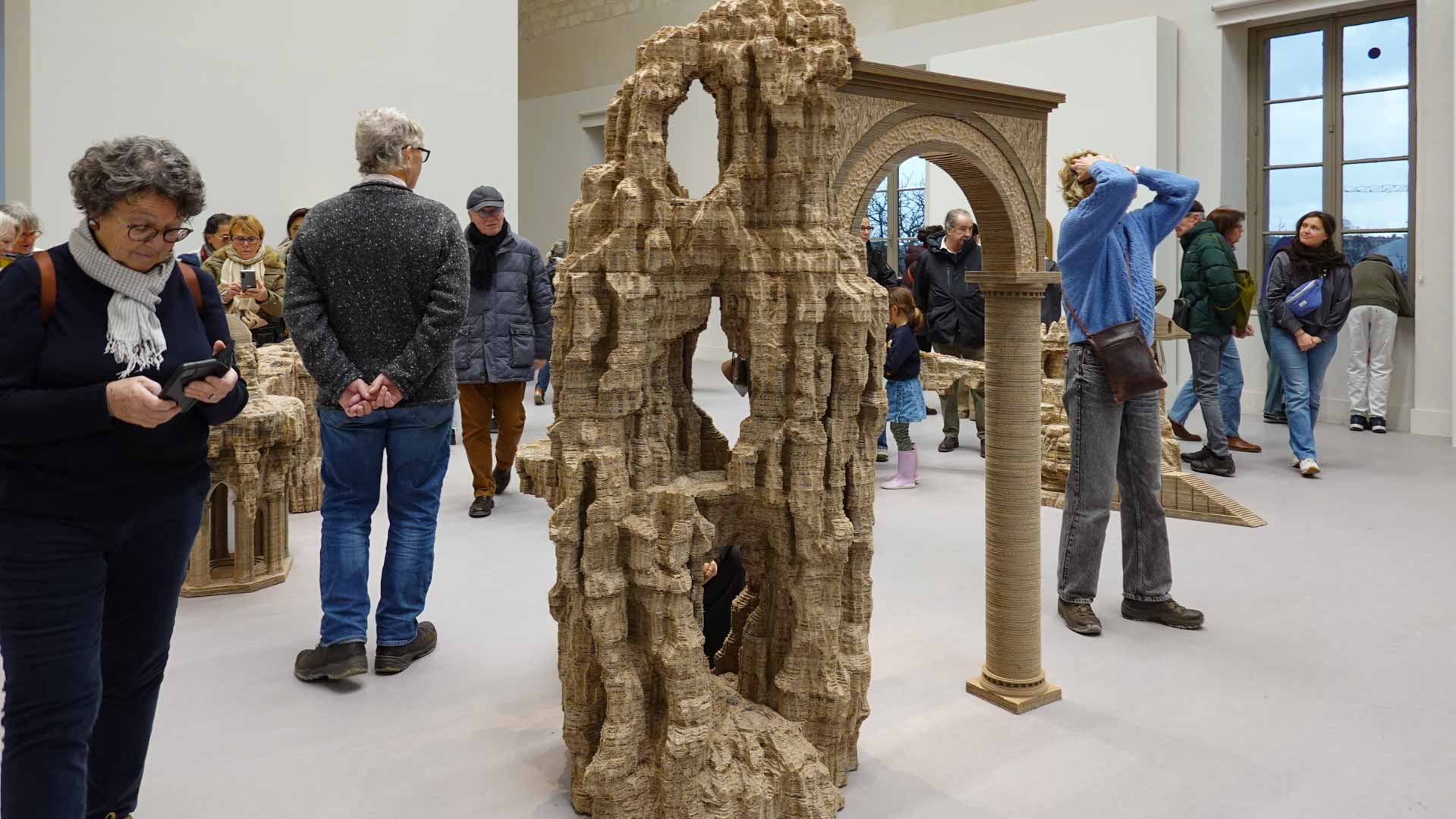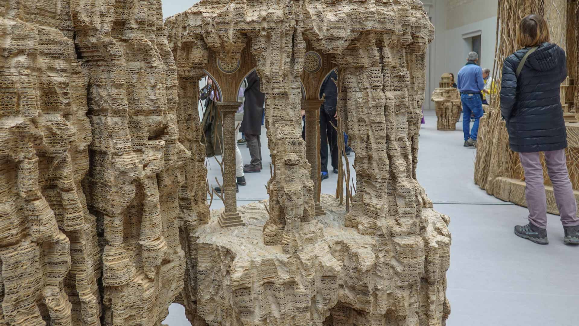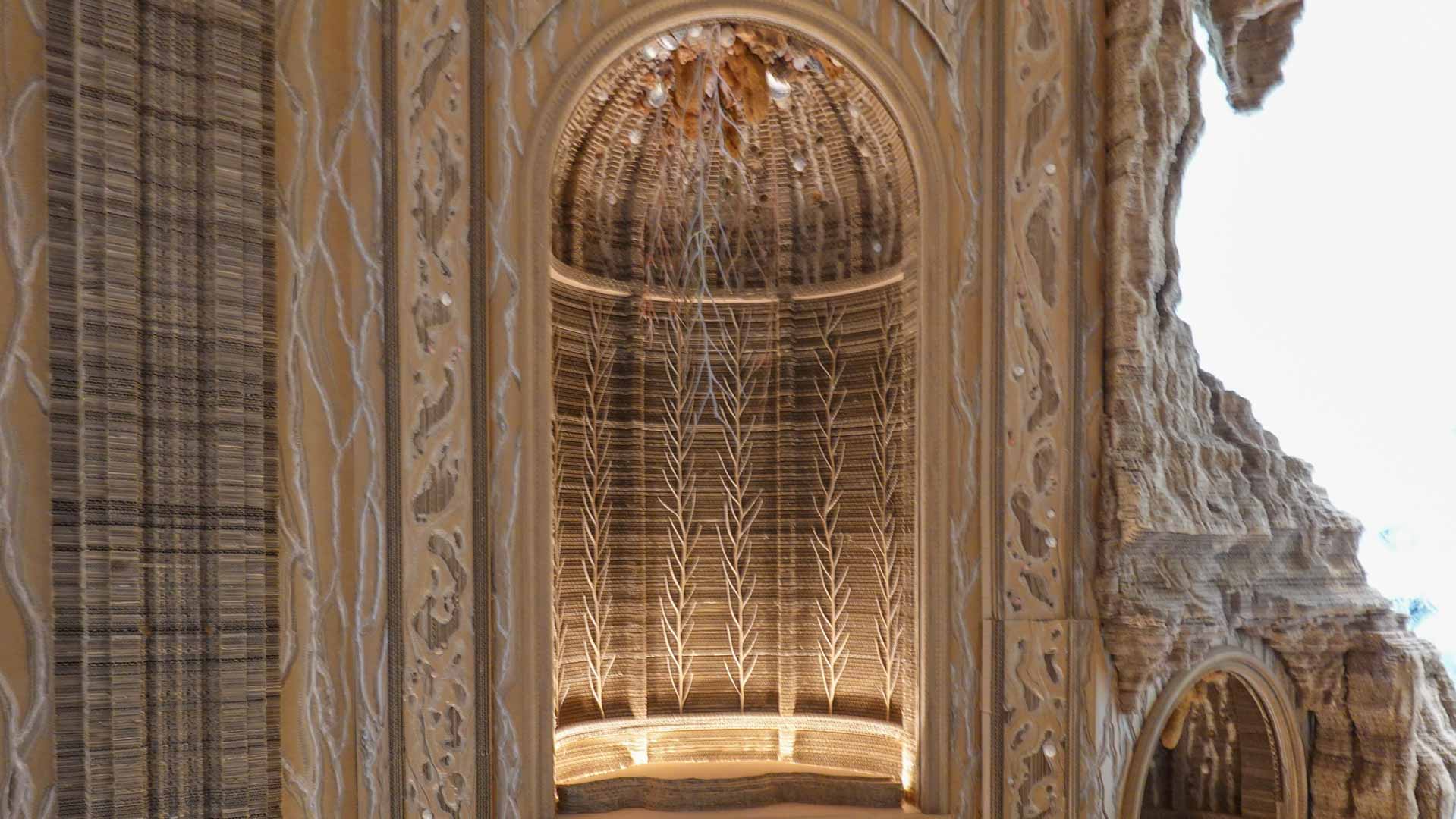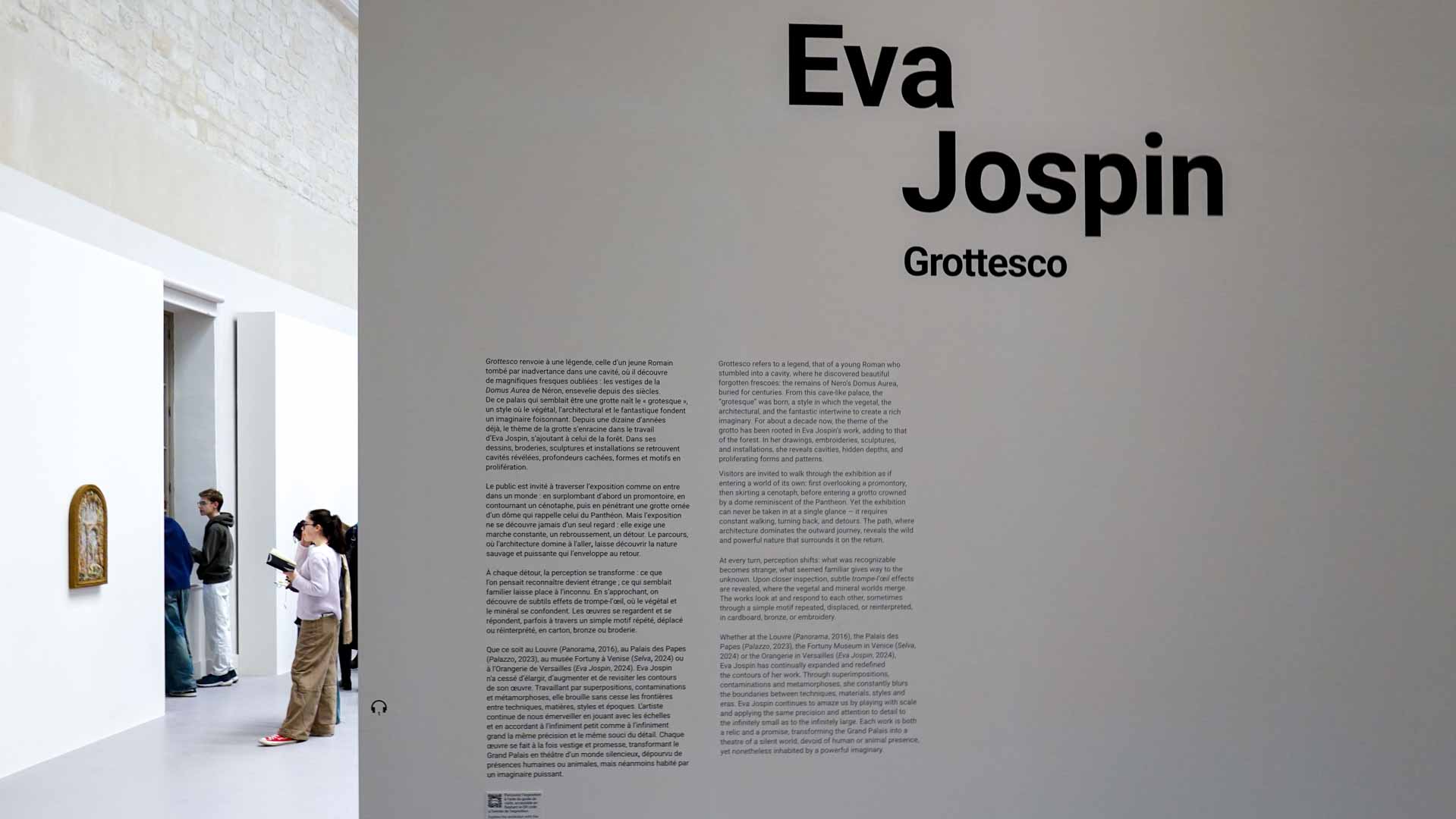 Le titre de l'exposition, Grottesco, renvoie à une légende : celle d'un jeune Romain, tombé par hasard dans une cavité oubliée où, sous terre, il découvre de magnifiques fresques. Ce n'est qu'ultérieurement que l'on reconnaîtra en ces vestiges la Domus Aurea de Néron, ensevelie depuis des siècles. À partir de ce palais qui semblait être une grotte naît le « grotesque » — un style où le végétal, l'architectural, le fantastique s'enlacent dans un imaginaire foisonnant.